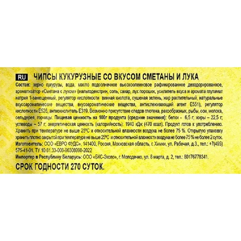 Состав: зерно кукурузы, вода, масло подсолнечное высокоолеиновое рафинированное дезодорированное, ароматизатор «Сметана с луком» (мальтодекстрин, соль, сахар, лук порошок, усилитель вкуса и аромата глутамат натрия 1-замещённый, регулятор кислотности винная кислота, сушёная зелень, жир растительный, натуральные вкусоароматические вещества, вкусоароматические вещества, антислеживающий агент Е551), регулятор кислотности Е526, антиокислитель Е319, эмульгатор Е900.