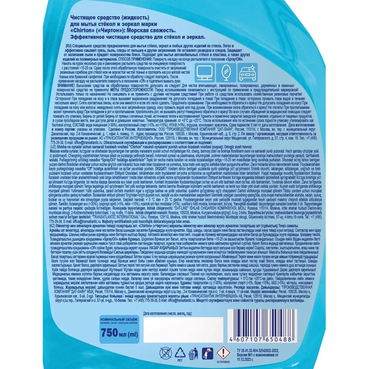 О товаре «Средство для стекол и зеркал Chirton Морская Свежесть 750 мл»