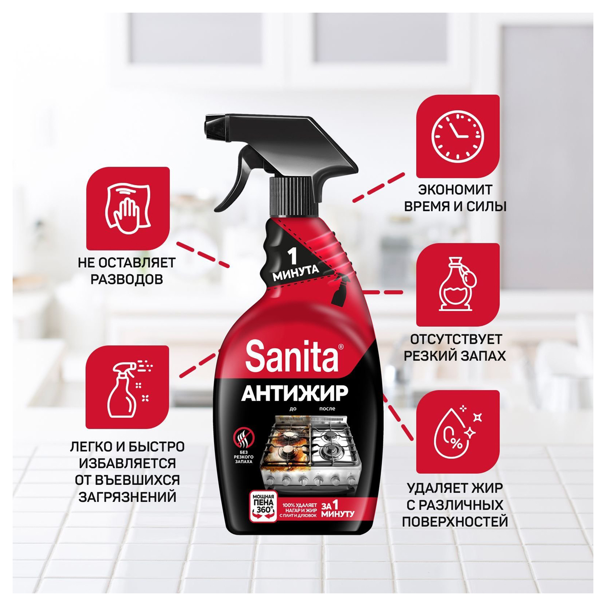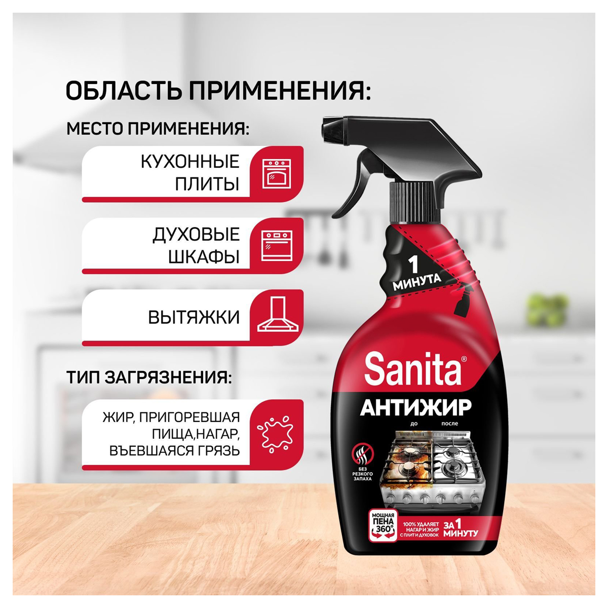О товаре «Чистящее средство для кухни (жироудалитель) Санита Антижир 0.5 л от жира и нагара спрей»