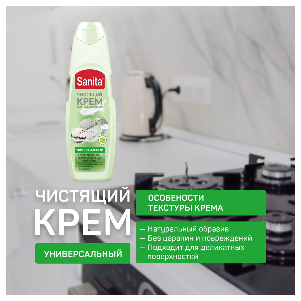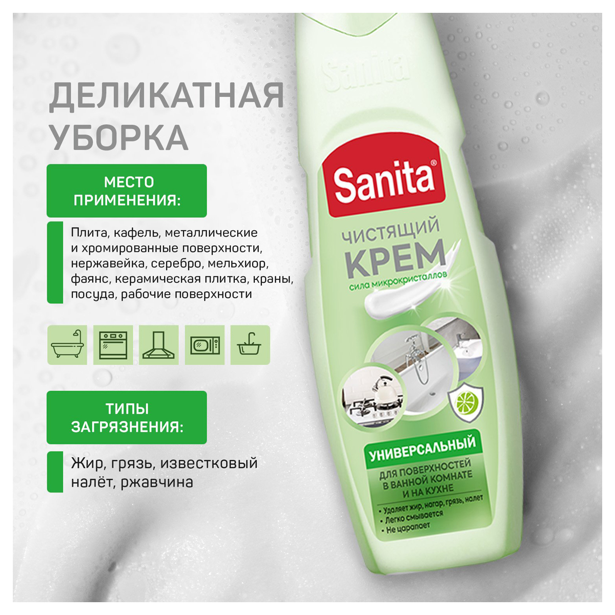 Назначение: средство предназначено для очистки кухонных поверхностей и ванной комнаты. Содержит особые микрогранулы, которые эффективно удаляют жир, грязь, нагар и известковый налёт. Бережно очищает поверхности, легко смывается, не оставляет разводов после высыхания.