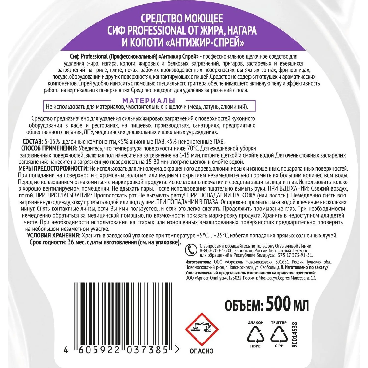 Назначение: чистящее средство (жироудалитель) Сиф Professional Антижир-спрей предназначено для очищения стойких кухонных загрязнений: жир и пригоревшая еда, известковых отложений, мыльного налёта.
