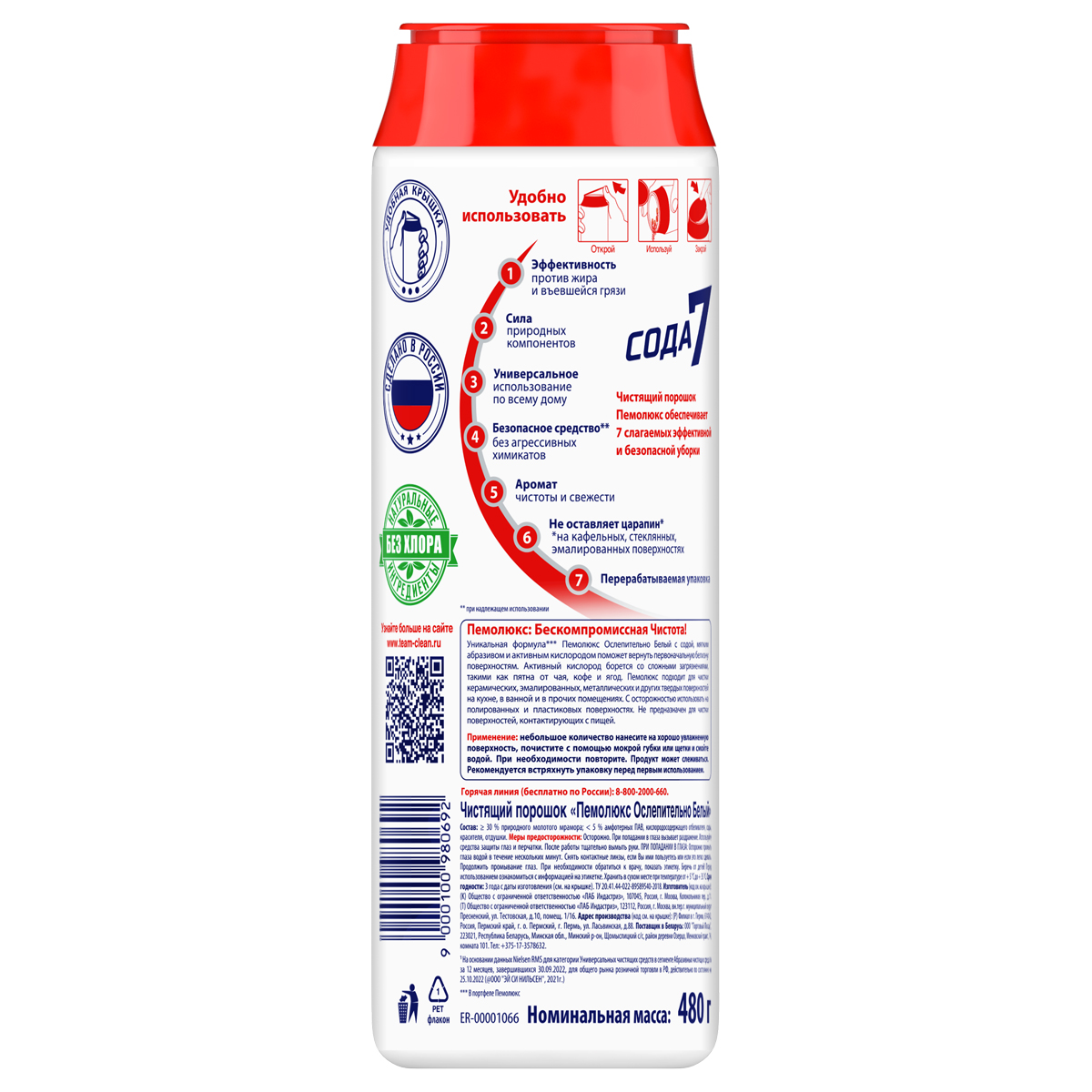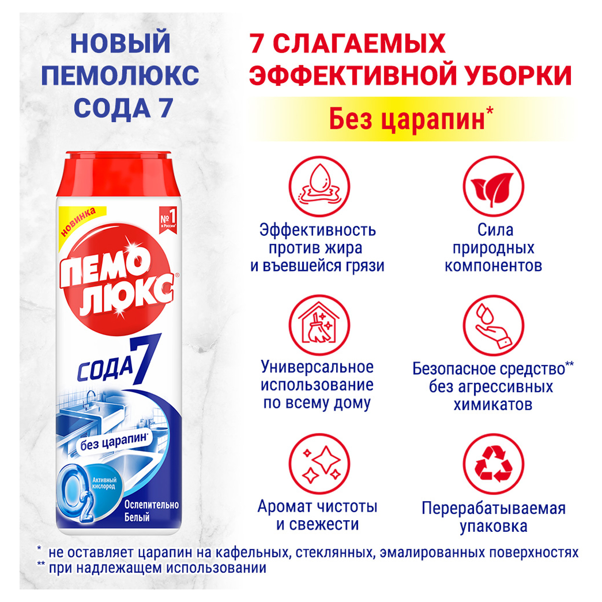 Чистящий порошок ПЕМОЛЮКС – универсальное средство для уборки дома. Порошок ПЕМОЛЮКС – это 7 преимуществ быстрой и эффективной уборки. - Пемолюкс не оставляет царапин*. - Средство эффективно борется с въевшейся грязью и жиром на любых поверхностях. - Формула порошка ПЕМОЛЮКС имеет натуральную основу. - Средство поможет навести чистоту во всех бытовых помещениях. - Порошок не содержит агрессивных химикатов, безопасен для посуды и кожи человека. - Средство ПЕМОЛЮКС дарит дому приятный аромат чистоты и свежести. - Перерабатываемая упаковка. *При надлежащем использовании. Применение: нанесите на влажную поверхность, почистите и смойте водой. Продукт может слеживаться. Встряхните упаковку перед первым использованием. Мощная формула ПЕМОЛЮКС с содой и мягким абразивом подходит для чистки керамических, эмалированных, металлических и других твердых поверхностей на кухне, в ванной комнате и прочих помещениях. С осторожностью использовать на полированных и пластиковых поверхностях. Не предназначен для чистки поверхностей, контактирующих с пищей. Состав: больше или равно 30% природного молотого мрамора; более 5% амфотерных ПАВ, соды, сульфата натрия, красителя, отдушки (в том числе лимонена, цитраля). Условия хранения: хранить в сухом месте. Температурный режим хранения не ограничен. Возможно поступление товара как в старом дизайне ПЕМОЛЮКС СОДА-7 "Ослепительно Белый", так и в новом ПЕМОЛЮКС "Чистота + Гигиена".