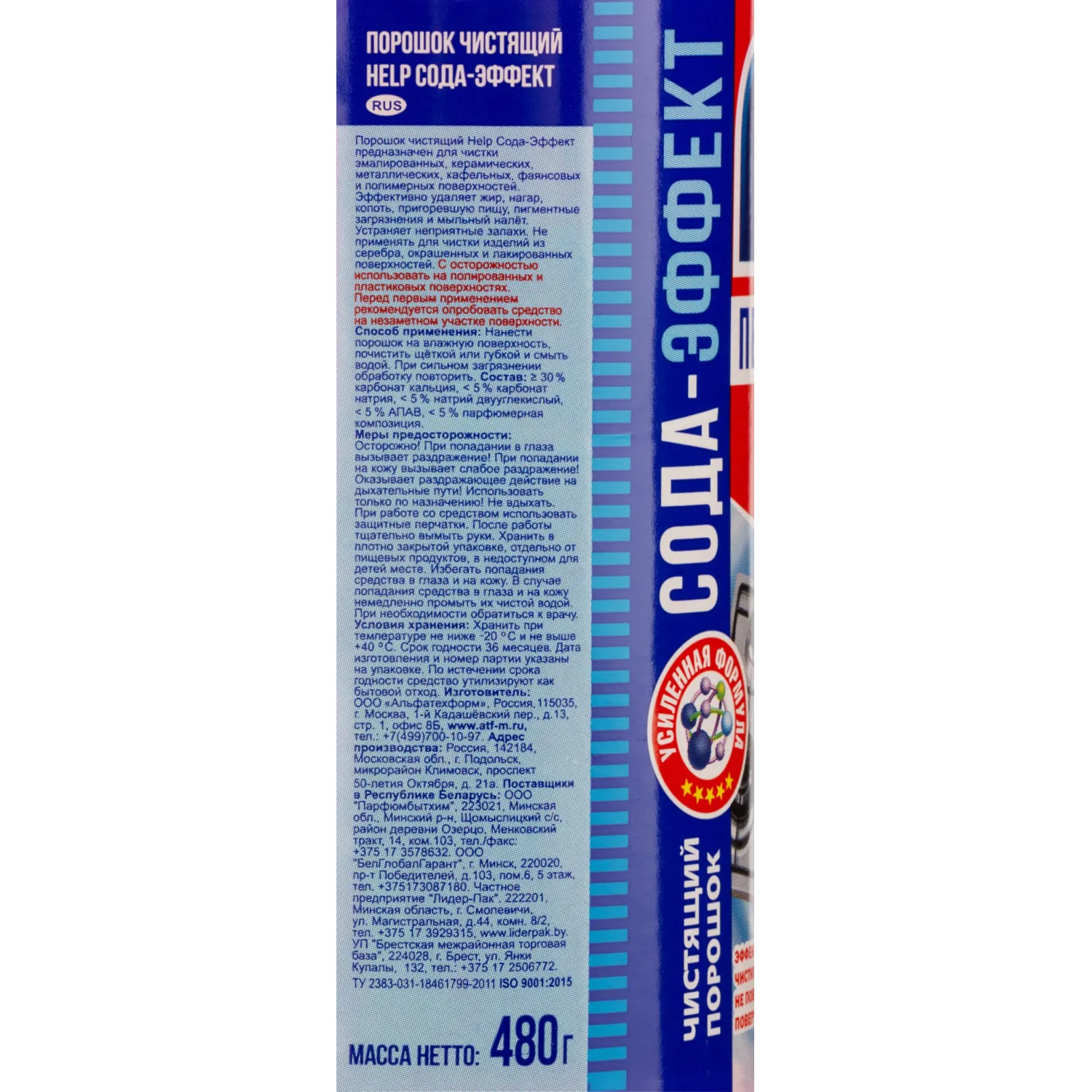 Состав: ≥30% карбонат кальция, <5% карбонат натрия, <5% натрий двууглекислый, <5% АПАВ, <5% парфюмерная композиция.