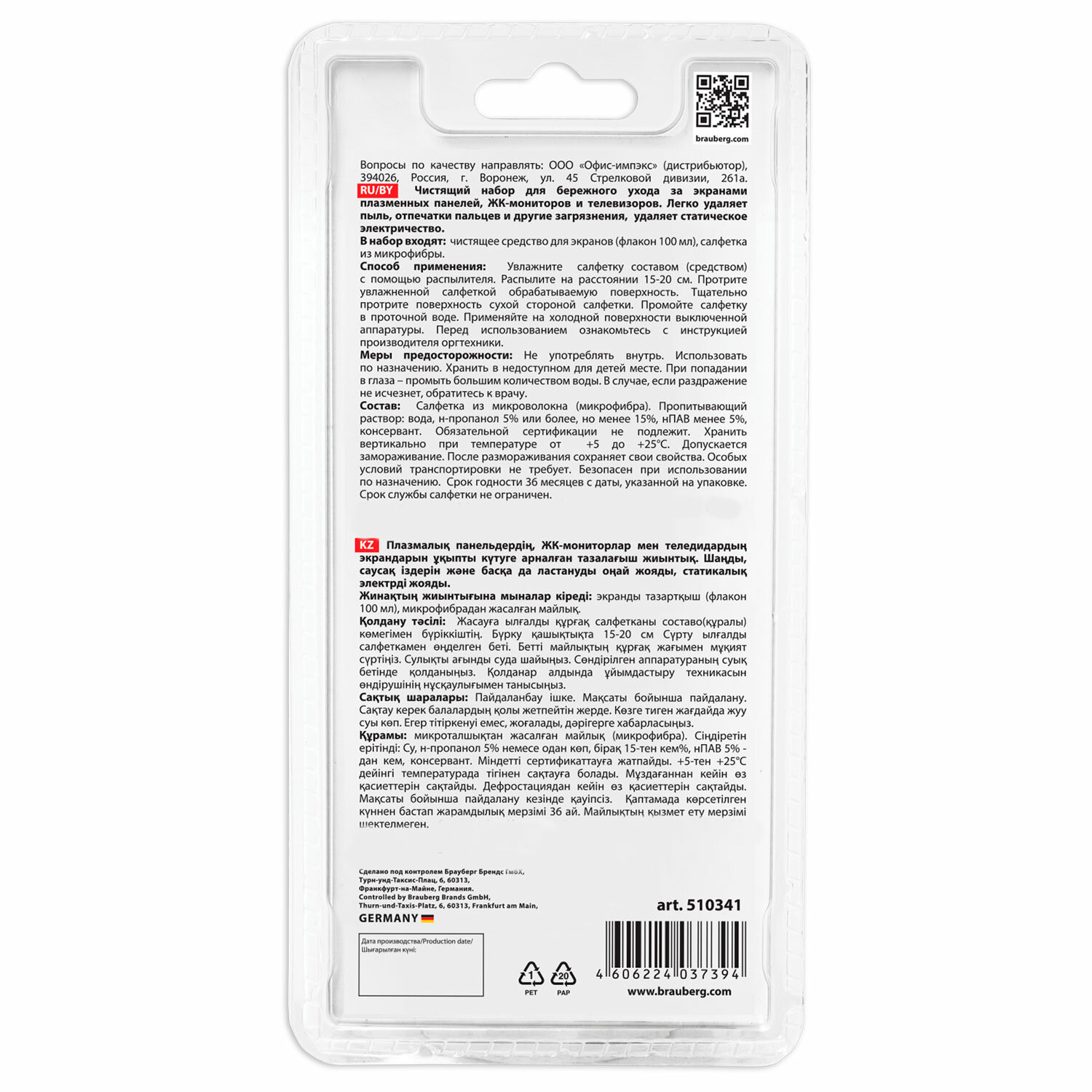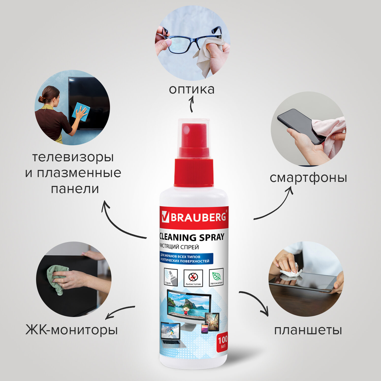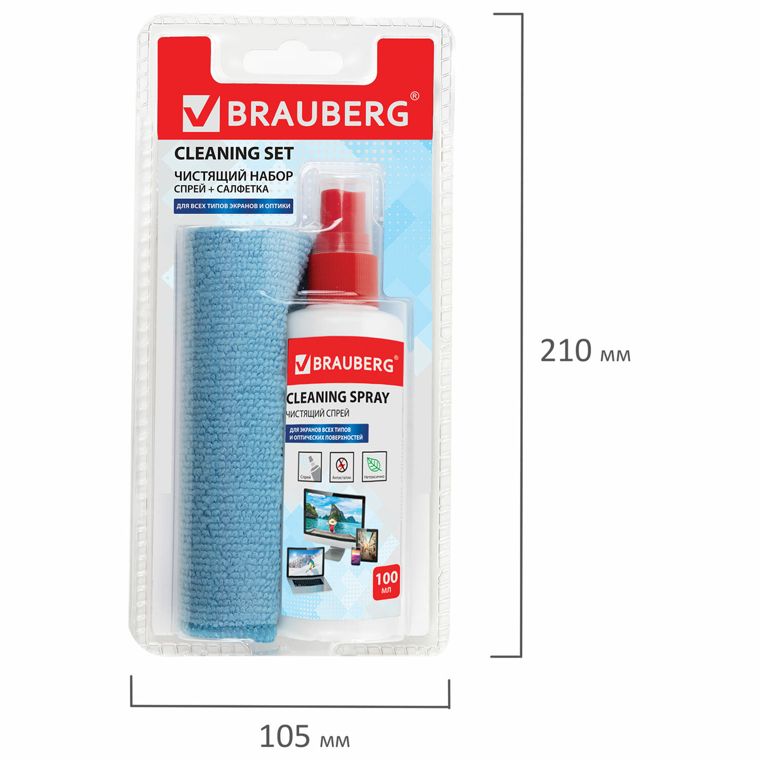 О товаре «Чистящий набор для экранов всех типов и оптики BRAUBERG, комплект салфетка и спрей, 100 мл, 510341»