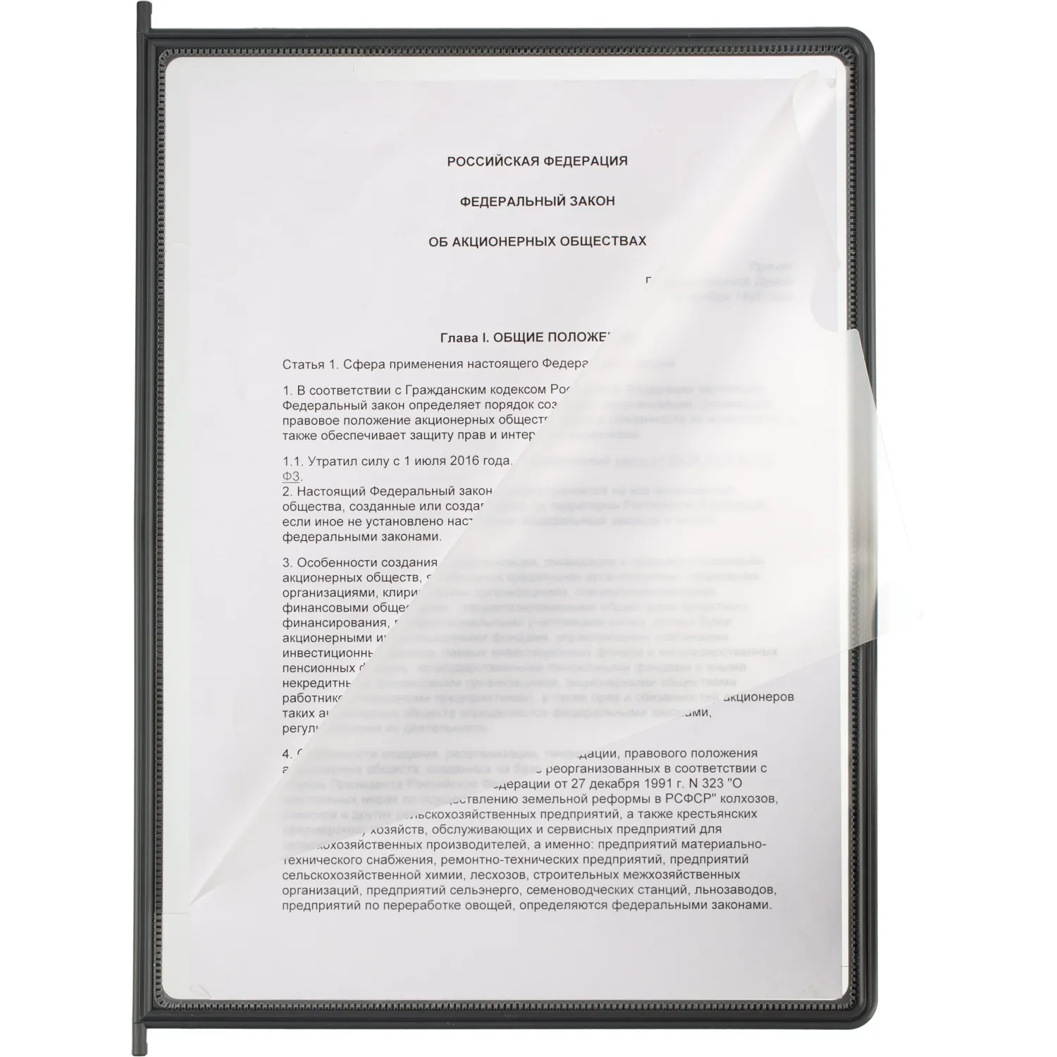 Демонстрационная система предназначена для размещения документов формата А4. В комплект входят 10 серых панелей с цветными закладками-табуляторами, которые помогают быстро находить нужные материалы и упрощают работу с информацией.