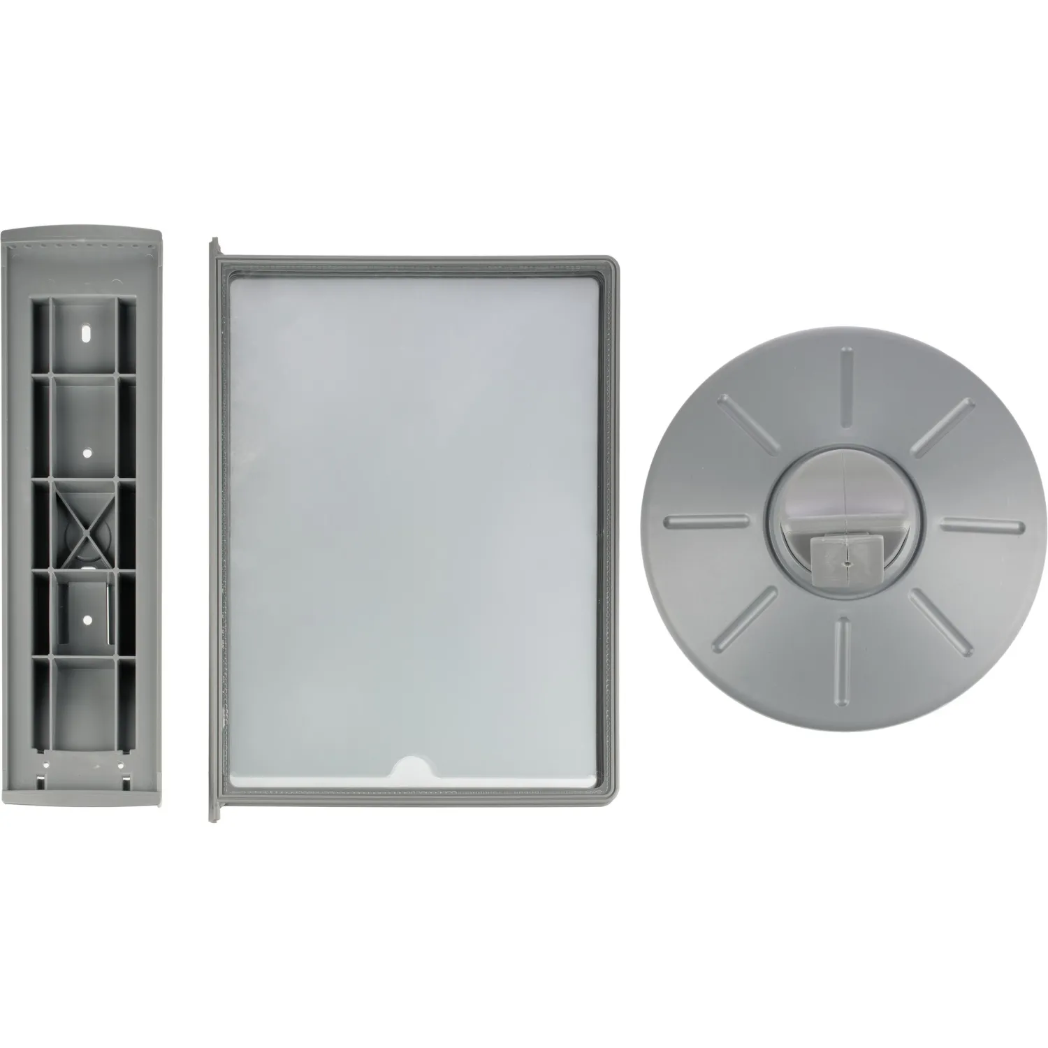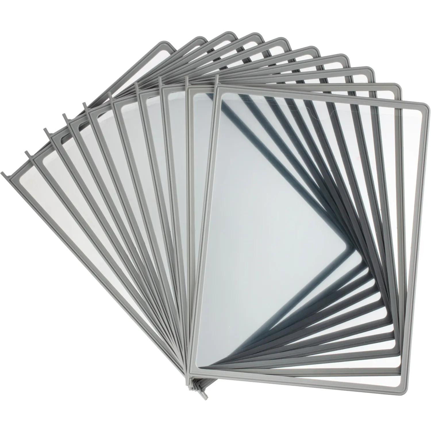Демонстрационная система предназначена для размещения документов формата А4. Она укомплектована 10 серыми панелями, что позволяет разместить до 20 листов. Панели можно легко переставлять, а карманы обеспечивают удобное хранение и представление информации.