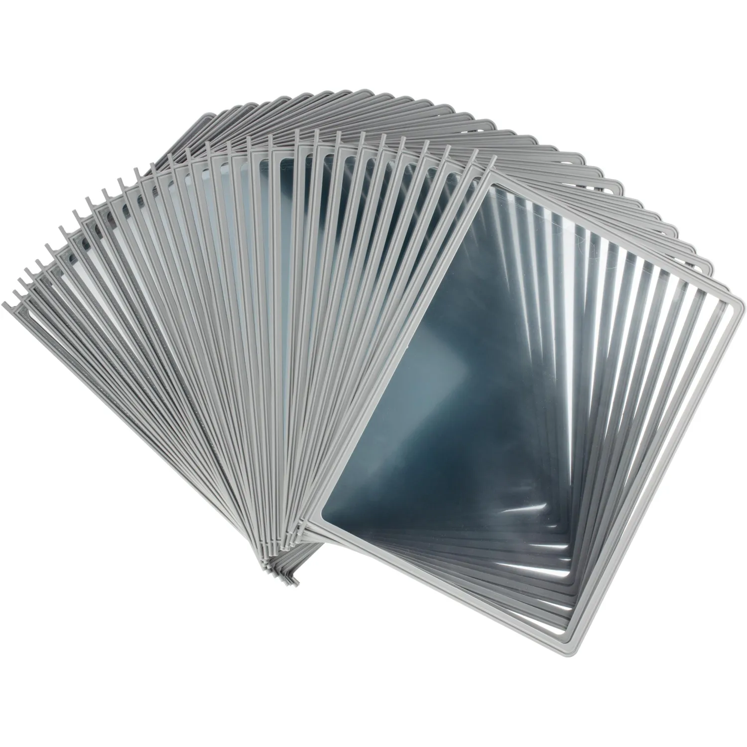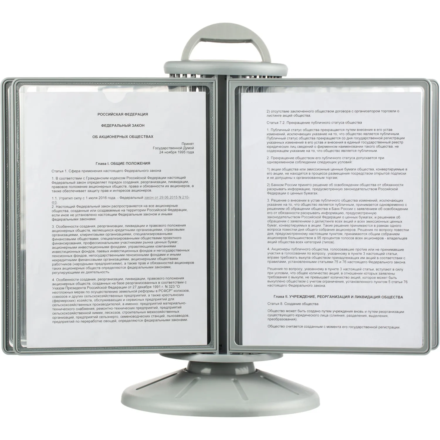 Демонстрационная система предназначена для размещения документов формата А4. Она оснащена 30 серыми панелями, что позволяет представить до 60 листов одновременно. Панели легко переставляются, а конструкция обеспечивает быстрый доступ к информации.