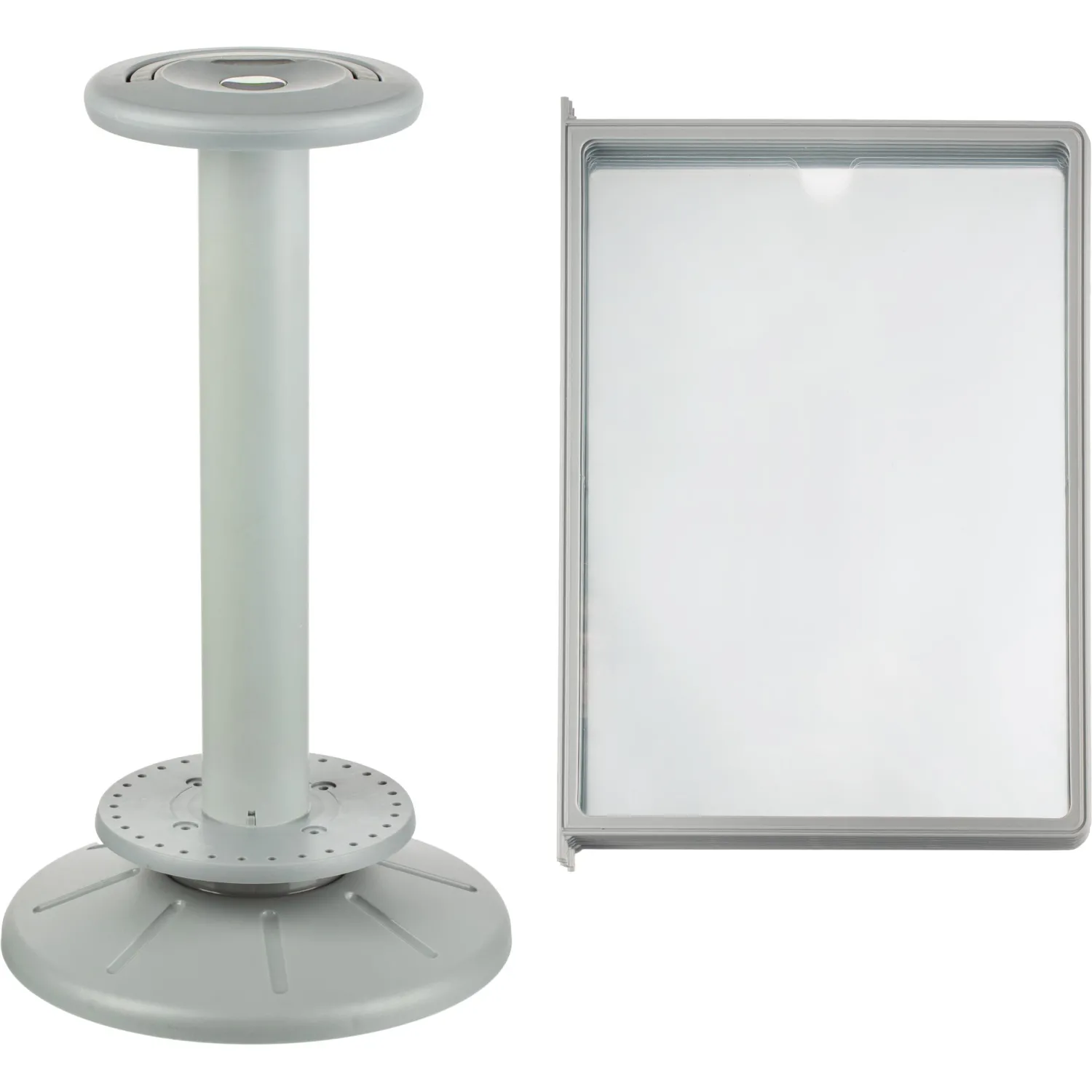 Система снабжена вращающимся механизмом на 360 градусов, что делает её удобной для работы нескольких пользователей. Утяжелённое основание с противоскользящими ножками гарантирует устойчивость при эксплуатации. В комплект входят настольное основание и панели. Изделие выполнено из пластика и поставляется в крафтовой упаковке.