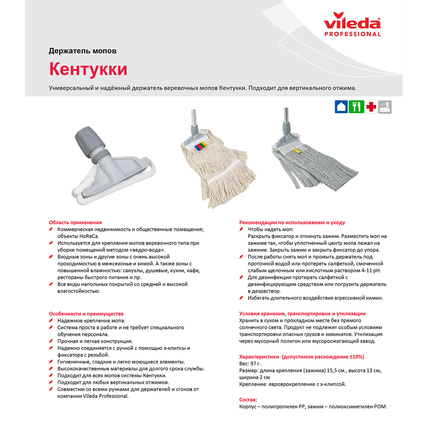 Держатель МОПа Vileda Кентукки предназначен для профессиональной уборки полов и представляет собой традиционную систему фиксации верёвочных насадок. Конструкция выполнена из прочных и долговечных материалов — полипропилена и полиэтилена, которые устойчивы к нагрузкам и агрессивным моющим средствам.