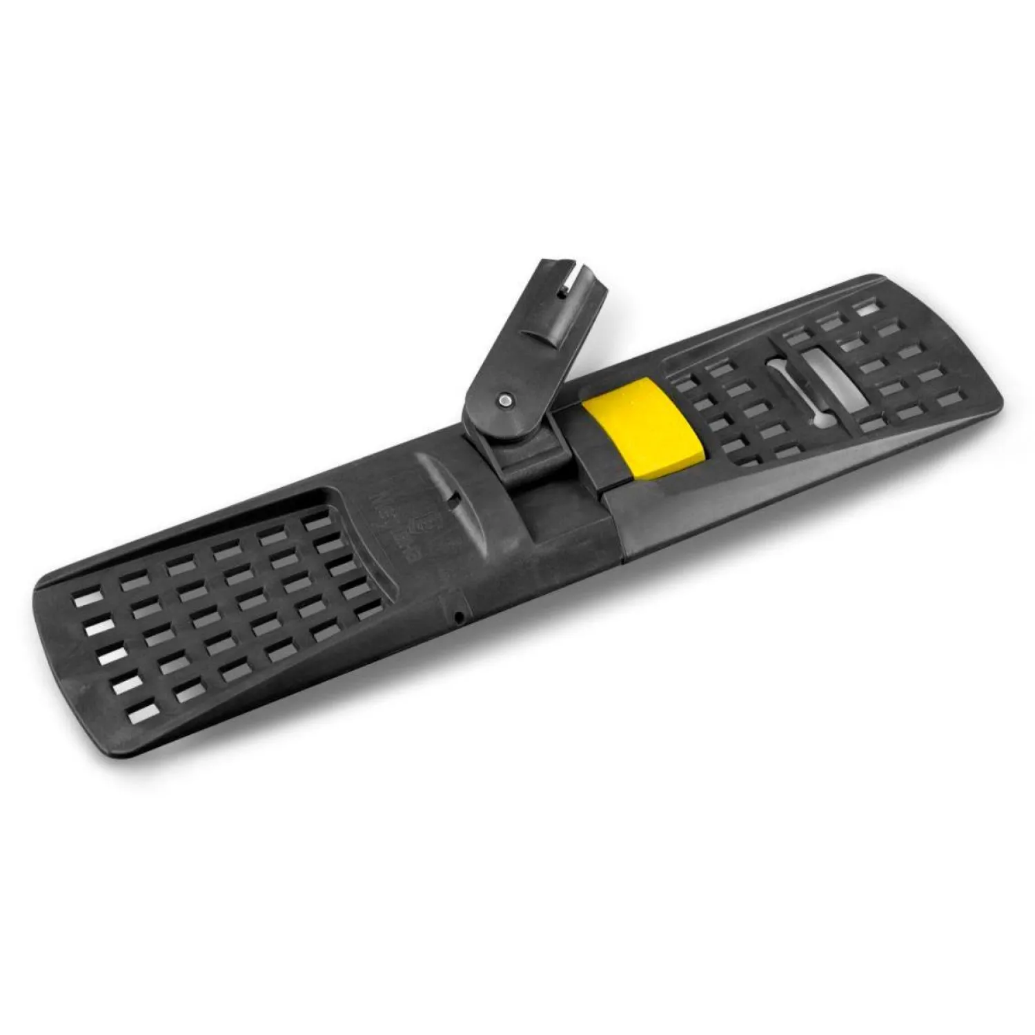 Держатель МОПа выполнен из пластика и предназначен для работы с плоскими швабрами-флаундерами. Конструкция снабжена кнопкой-защёлкой: для установки или замены МОПа держатель раскладывается нажатием на кнопку, а фиксация в рабочем положении осуществляется при нажатии рукояткой на установленный на пол держатель.