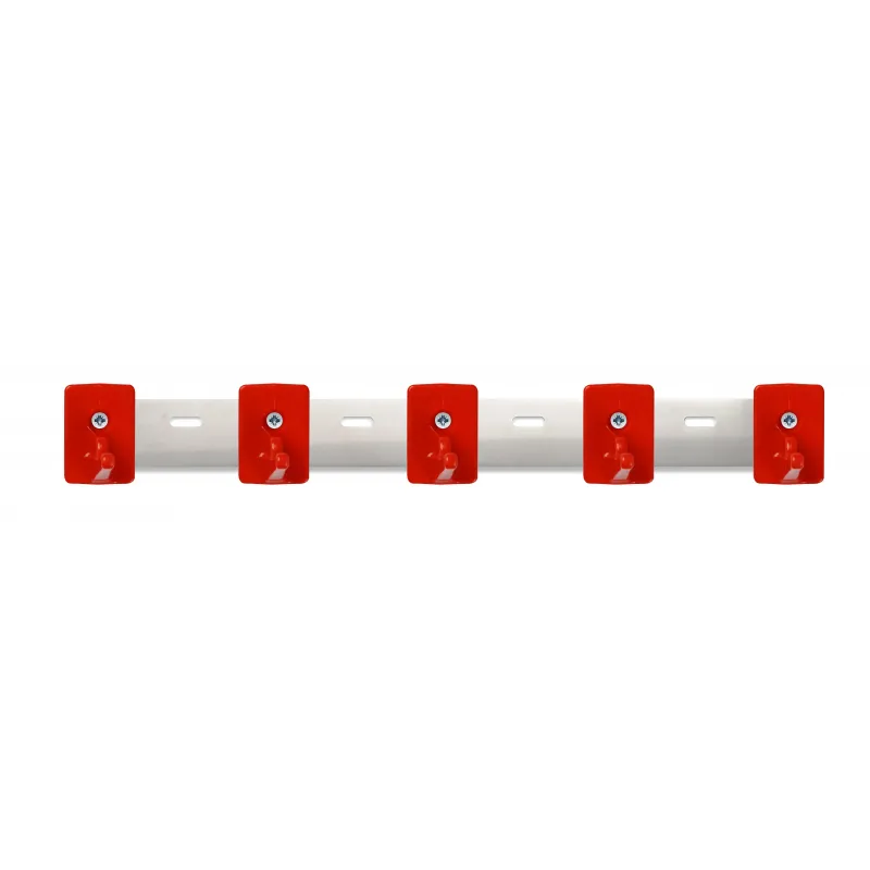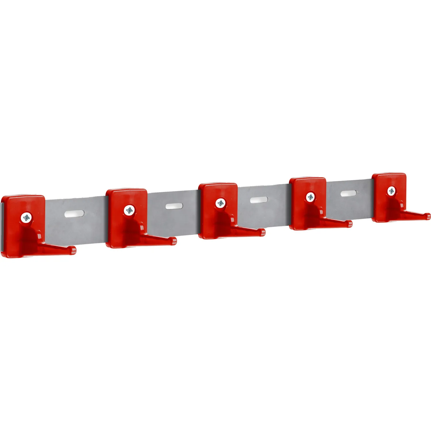 Держатель настенный предназначен для хранения производственного и уборочного инвентаря, инструментов. Размер держателя с крючками (ДхШ): 352х77 мм. Вес: 288 г. Цвет: красный/металлик. Максимальная нагрузка на 1 крючок: 10 кг. В комплект входит 5 крючков, крепежный набор. Возможно доукомплектование дополнительным набором крючков для хранения 9 предметов. Гигиеничен, легко моется, изготовлен из материалов, устойчивых к агрессивным моющим растворам - нержавеющей стали, полипропилена. Подходит для пищевых производств, HoReCa, клининга.