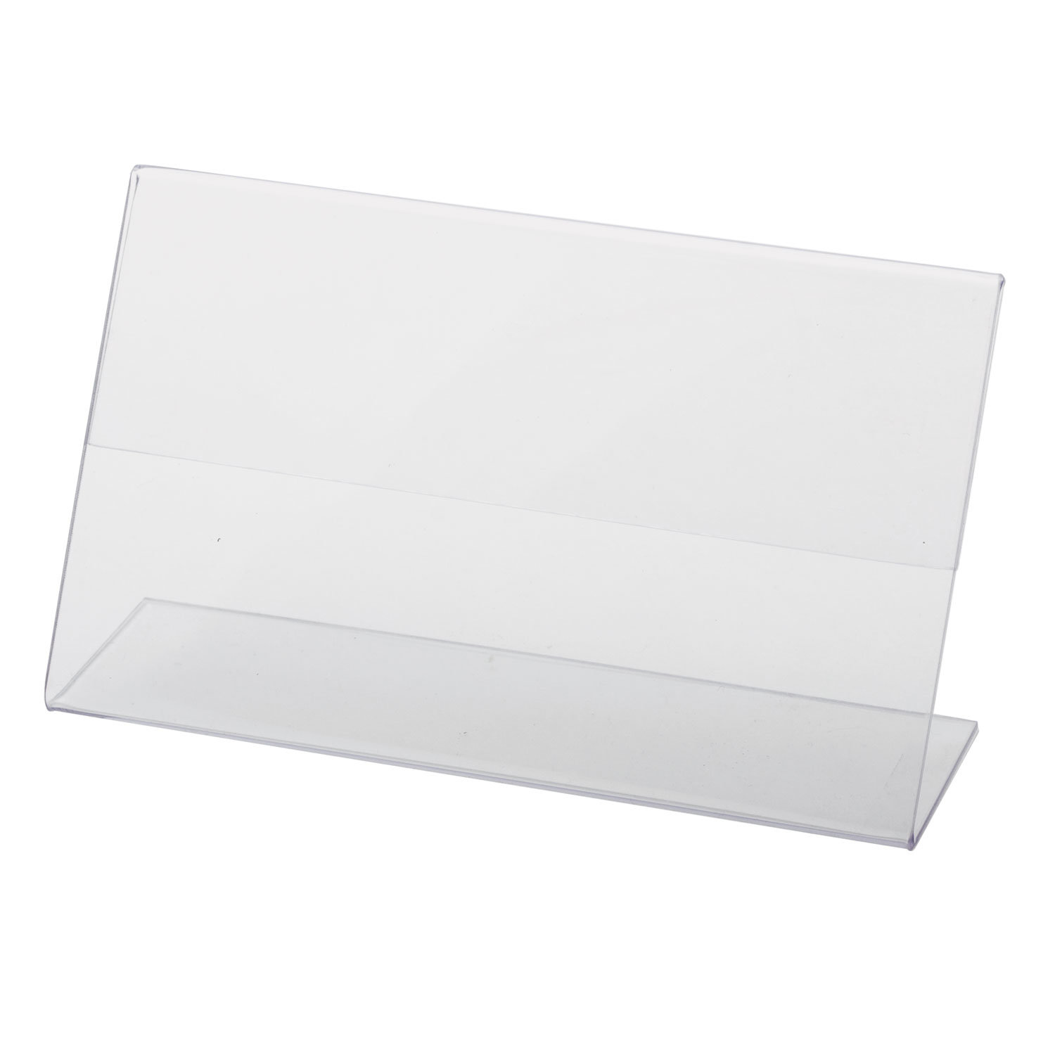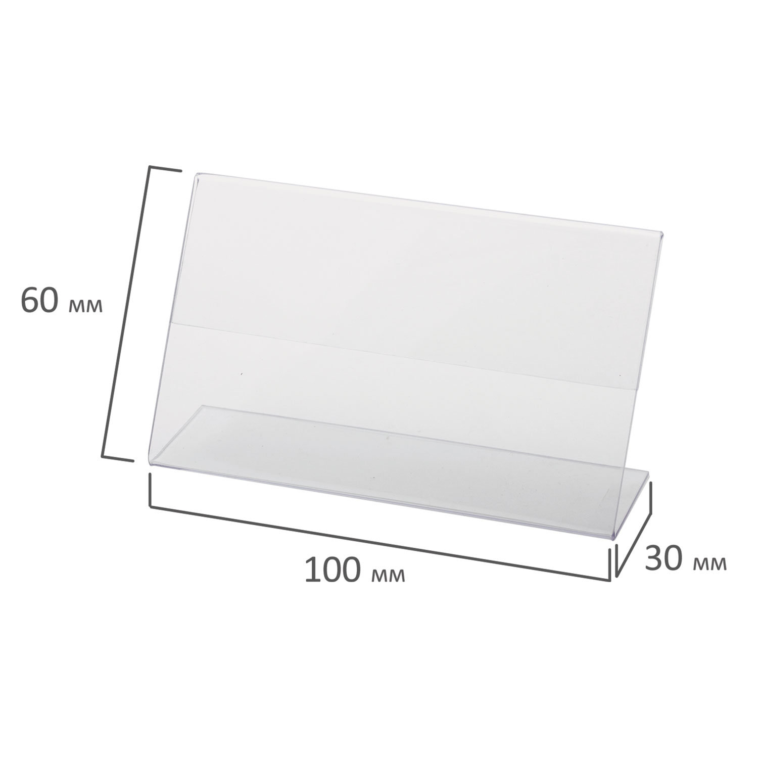 Изготовлена из прозрачного акрилового стекла толщиной 1 мм. Имеет размер 100х60 мм. Максимальная толщина вставки составляет 1,5 мм, глубина основания держателя информации - 30 мм, ширина ножки - 1 мм. 5 штук в комплекте.