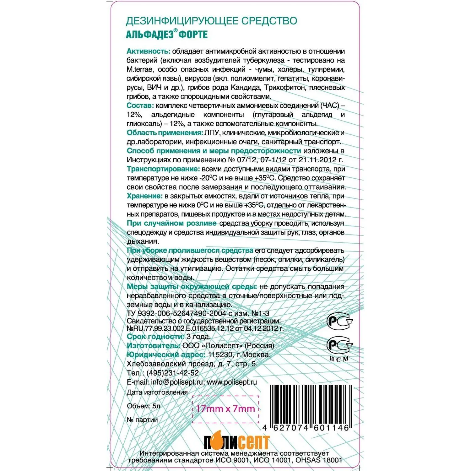 Состав: ЧАС — 12%, глутаровый альдегид — 12%, глиоксаль и другие компоненты.