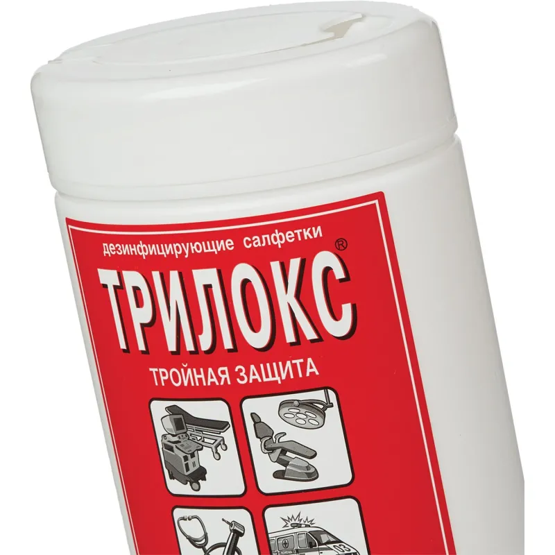 Готовые к применению влажные дезинфицирующие салфетки из белого нетканого материала, равномерно пропитанные дезинфицирующим раствором ТРИЛОКС с минимальным эффективным содержанием спирта для быстрой дезинфекции небольших по площади поверхностей и оборудования.