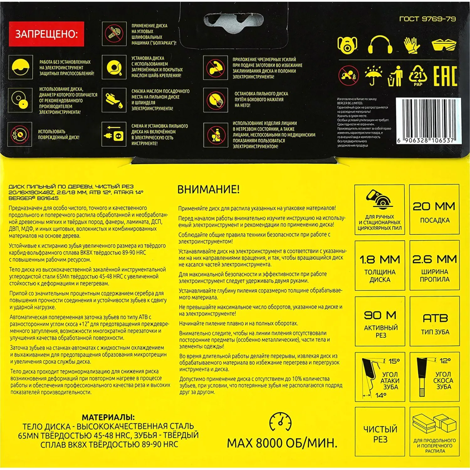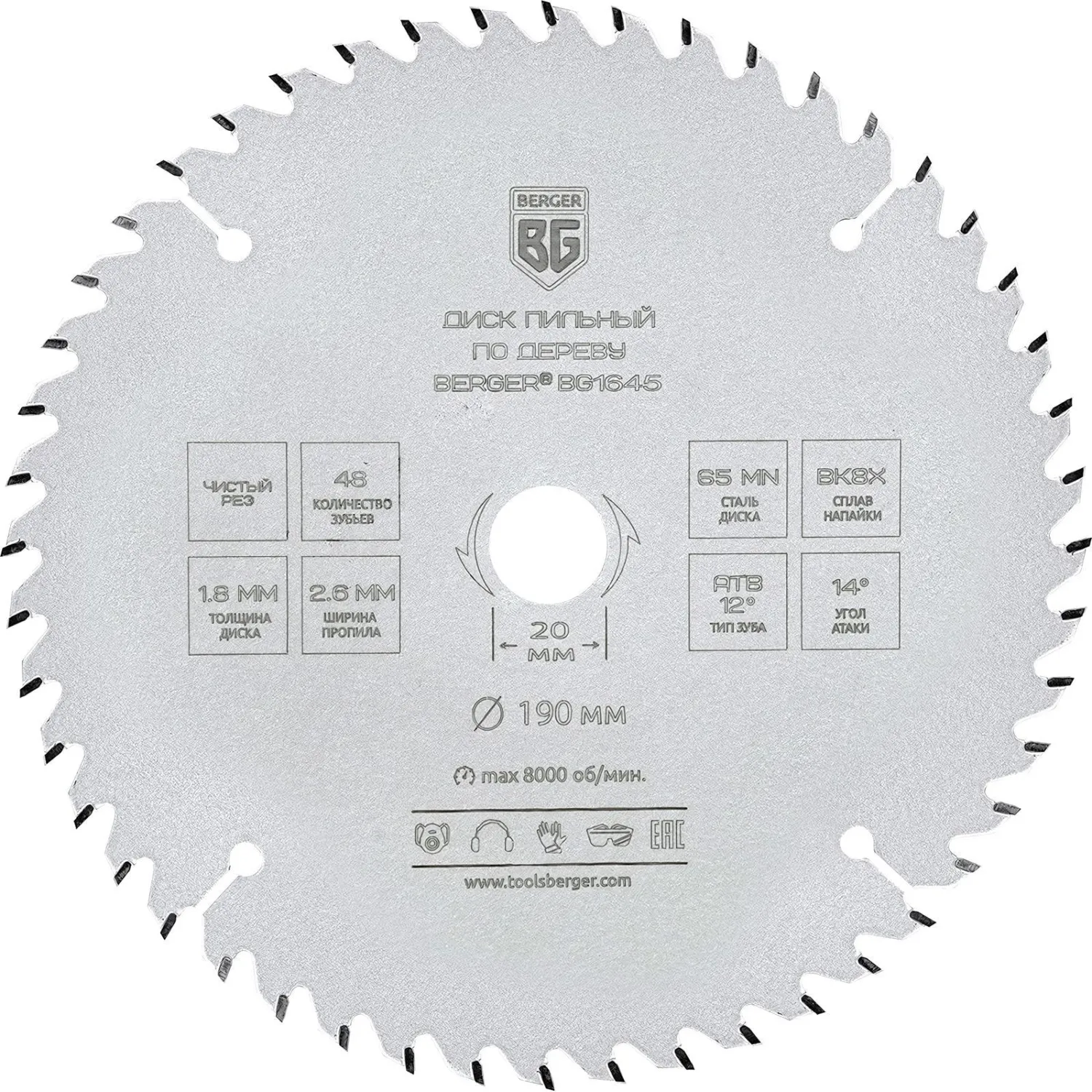 О товаре «Диск пильный по дереву BERGER, d190x20/16мм, 48зуб, чистый рез (BG1645)»