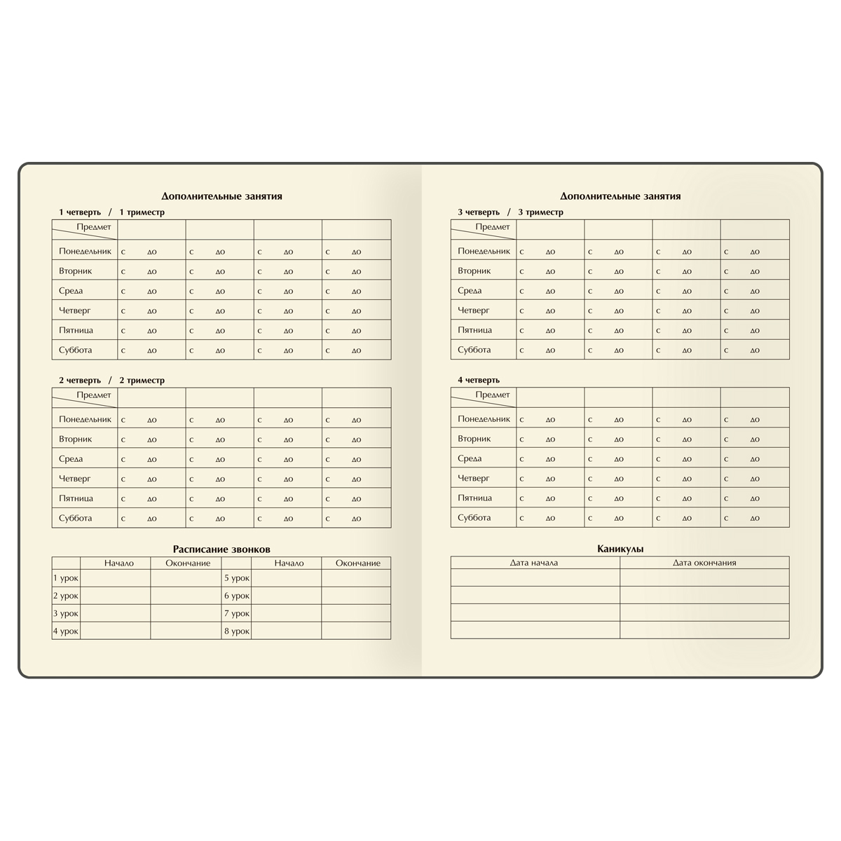 Твёрдый переплёт гарантирует, что дневник прослужит в течение всего учебного года, сохранив внешний вид. Внутренний блок состоит из 48 листов тонированной офсетной бумаги плотностью 70 г/м2. Печать блока в 1 краску. Учебный день рассчитан на 8 уроков. В дневнике школьник обнаружит справочные материалы, которые помогут быстро найти ответы на вопросы и закрепить знания.