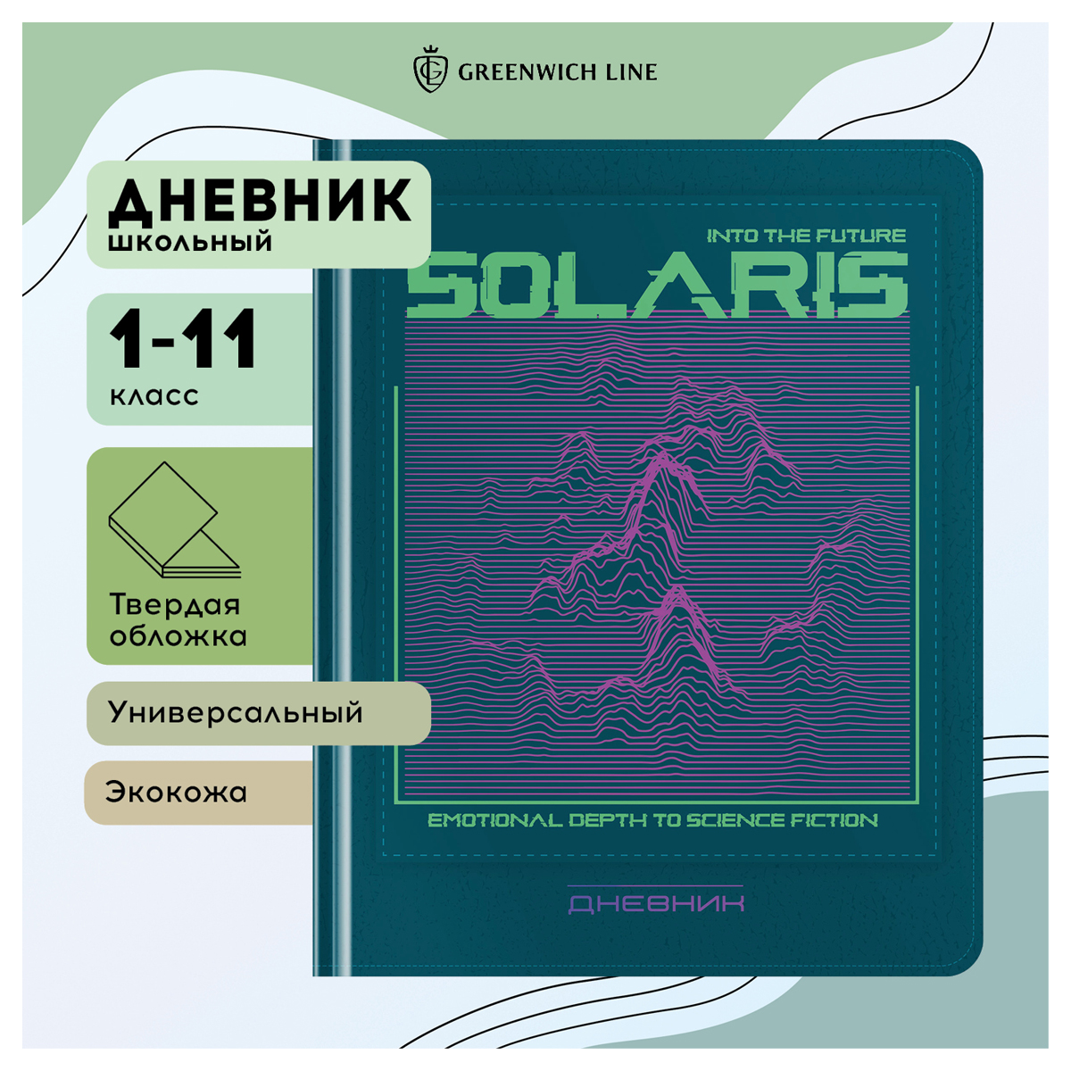 О товаре «Дневник 1-11 кл. 48л. (твердый) Greenwich Line "Solaris", иск. кожа, аппликация с УФ-печатью, тисн. фольгой, , тон. блок, ляссе»