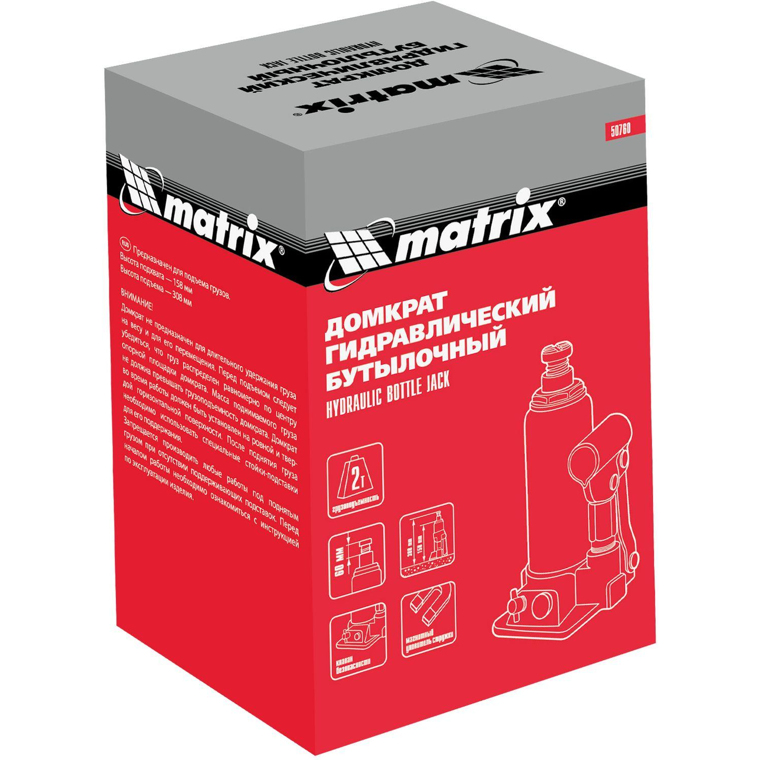 Домкрат гидравлический бутылочный Matrix 2 тонны158-308 мм (50760)