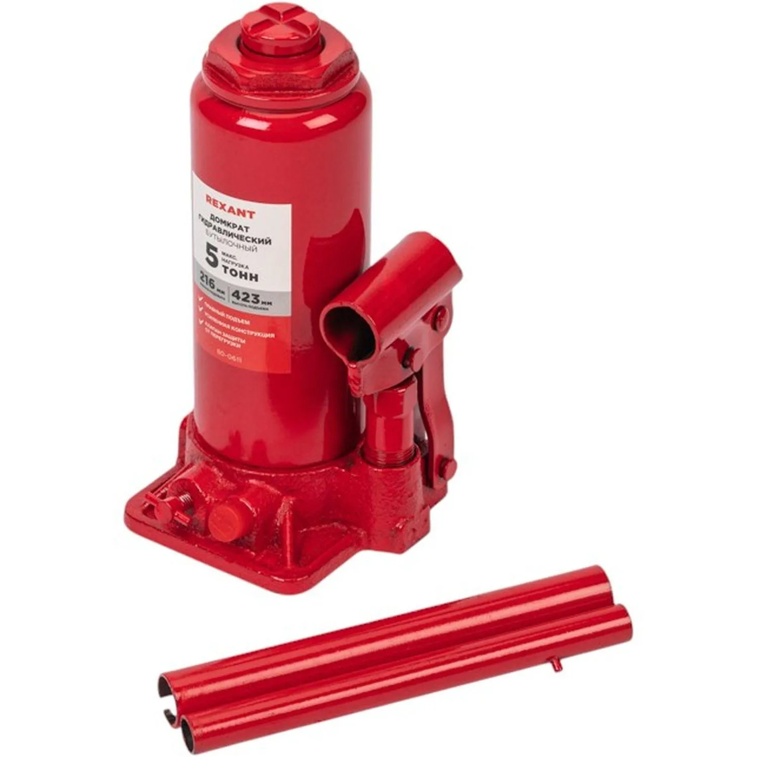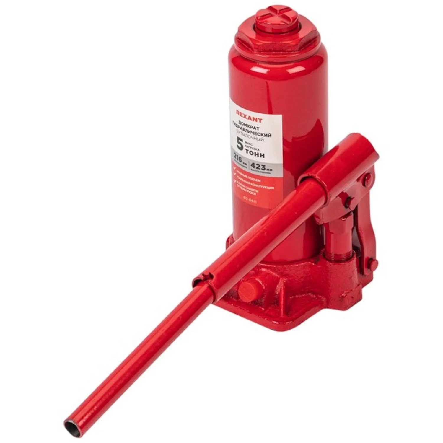 Гидравлический бутылочный домкрат Rexant предназначен для поднятия грузов массой до 5 тонн на высоту до 423 мм. Оптимален для автомобилей с большим клиренсом. Оснащен гидравлической системой, обеспечивающей высокую мощность и надежность. Домкрат станет незаменимым помощником как для автолюбителей при проведении технического обслуживания и ремонта. Отличается плавностью хода, надежностью и жесткостью конструкции. Клапан безопасности предотвращает подъем груза тяжелее 3 т, предохраняя домкрат от поломки.