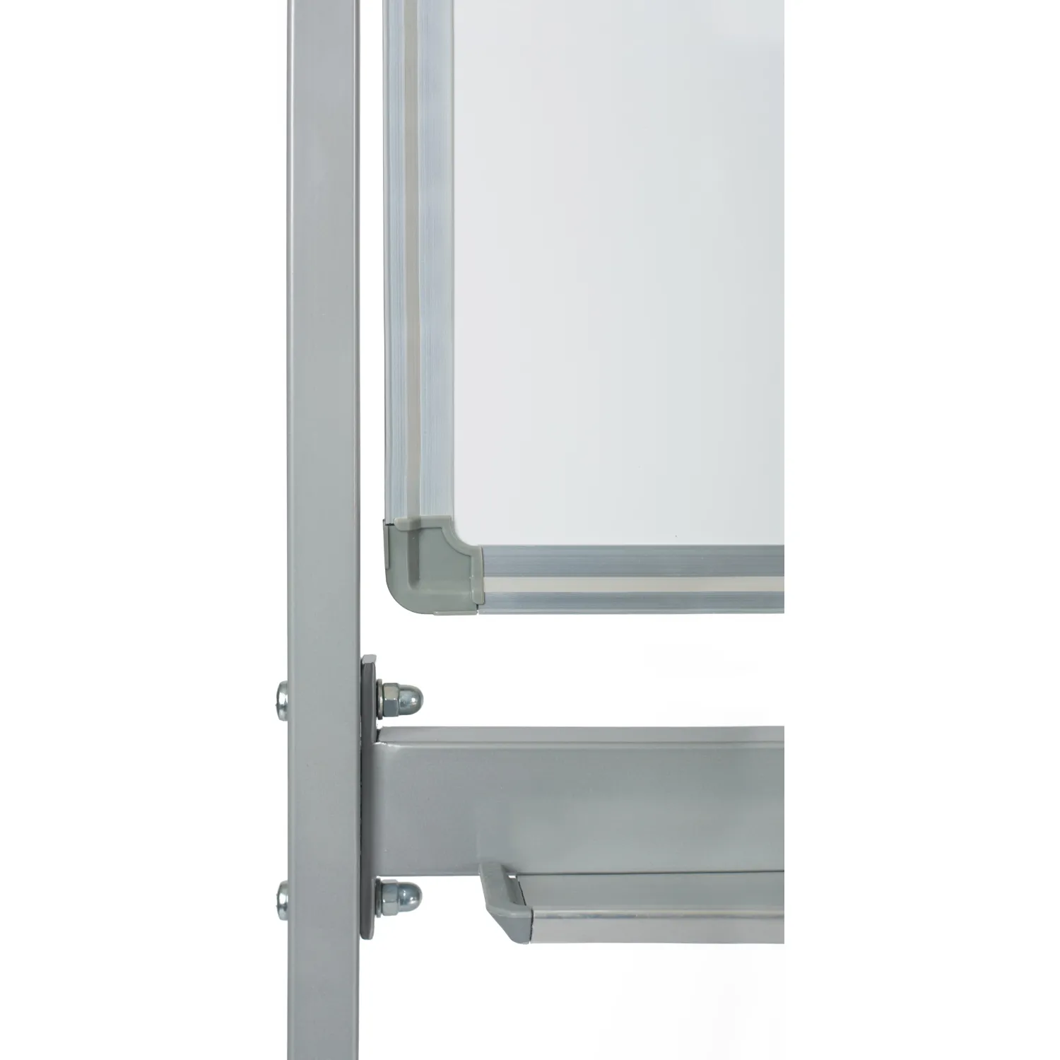 Магнитно-маркерная доска является мобильным решением для офисов и учебных заведений. Доска вращается на 360 градусов, что позволяет использовать обе её стороны для записи. Фиксация доски в нужном положении осуществляется с помощью ручки-фиксатора, который позволяет установить полотно под произвольным углом. Стойки доски оснащены поворотными колёсами, что делает её удобной для перемещения по помещению, а фиксаторы на колёсах обеспечивают надёжную блокировку.