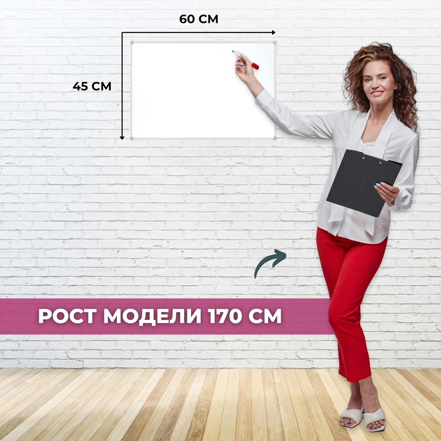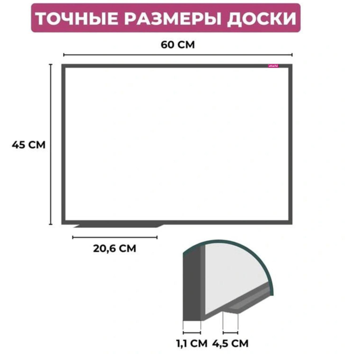 Доска комплектуется полочкой для маркеров и скрытым креплением, что обеспечивает её надёжную фиксацию на стене в четырёх точках. Размер рабочей поверхности составляет 41.8×55.8 см, а благодаря утончённой алюминиевой раме шириной всего 11 мм, она позволяет максимально использовать доступное пространство. Рама не снимается, глубина доски с рамой — 17 мм, без — 12-14 мм.