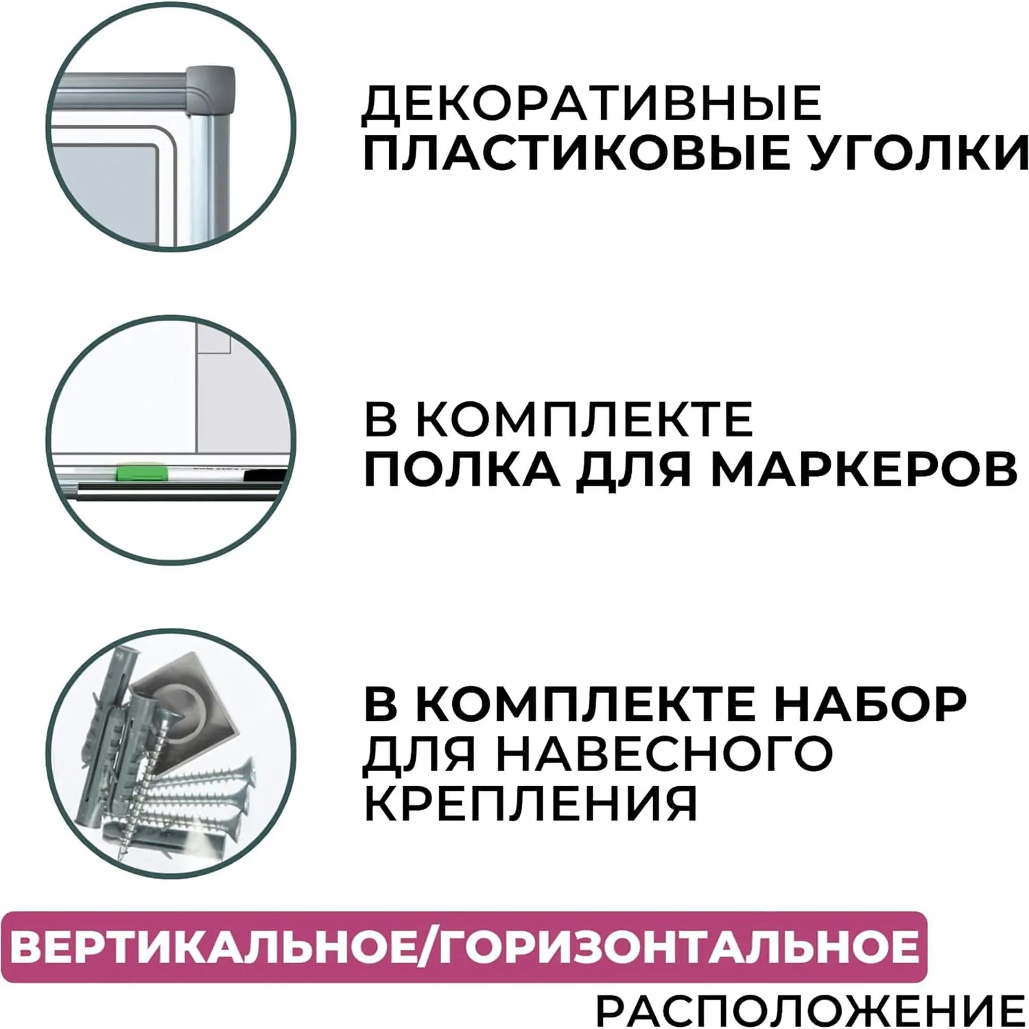 В комплект входит полочка для маркеров и крепежи для настенного монтажа. Для удаления записей рекомендуется использовать специальные губки-стиратели в комбинации с чистящим спреем для более тщательной очистки поверхности. Размер рабочей поверхности составляет 560×870 мм. Доска оснащена премиум профилем овального сечения шириной 21 мм, что придаёт конструкции увеличенную прочность и надёжность.