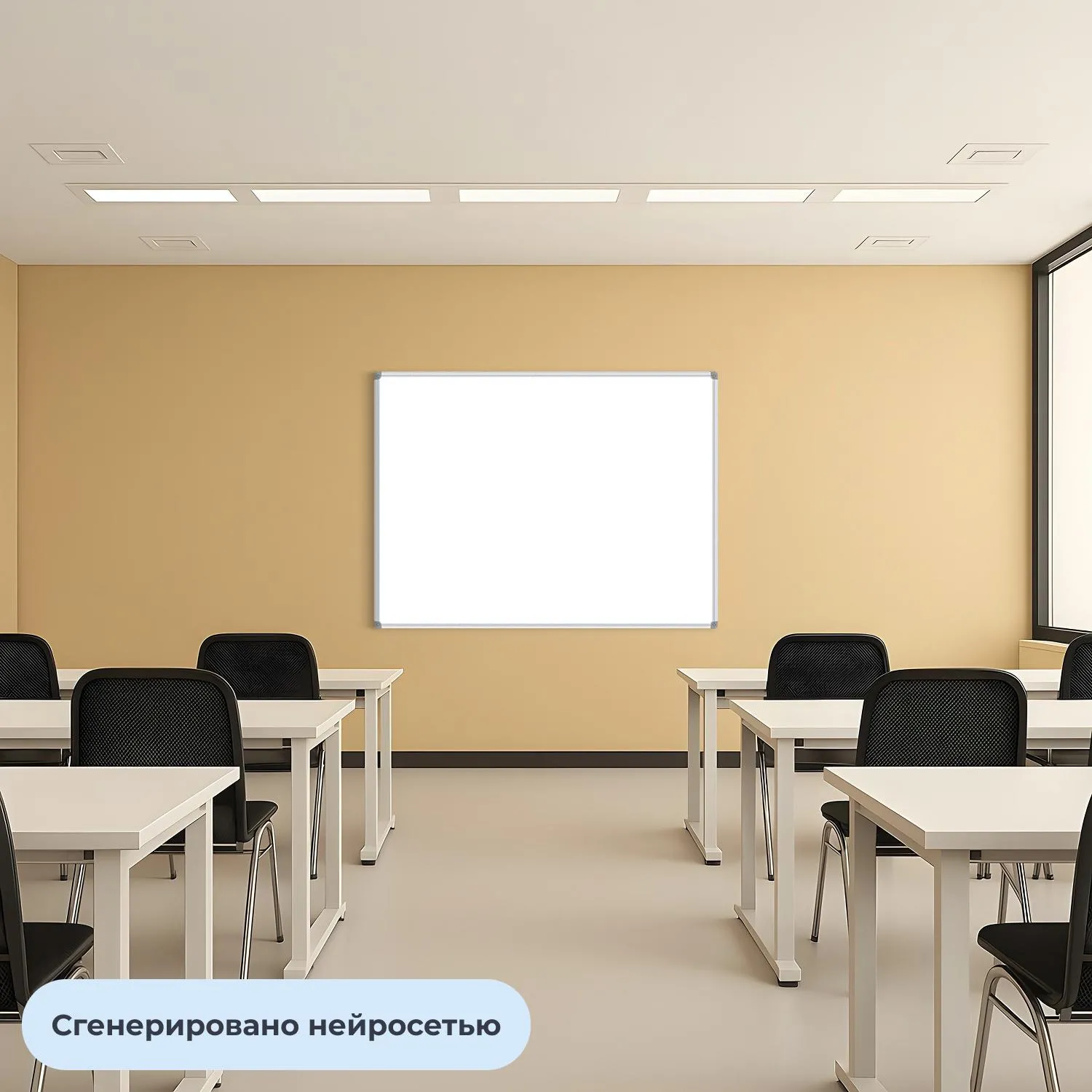 Доска имеет надёжное крепление в четырёх точках и возможность установки как в вертикальной, так и в горизонтальной ориентации. Размер рабочей поверхности составляет 97×148 см, а конструкция с центральной частью толщиной 10 мм и габаритной толщиной с рамой 16 мм гарантирует прочность и надёжность. В комплект входит набор креплений для самостоятельного монтажа и полочка для маркеров.