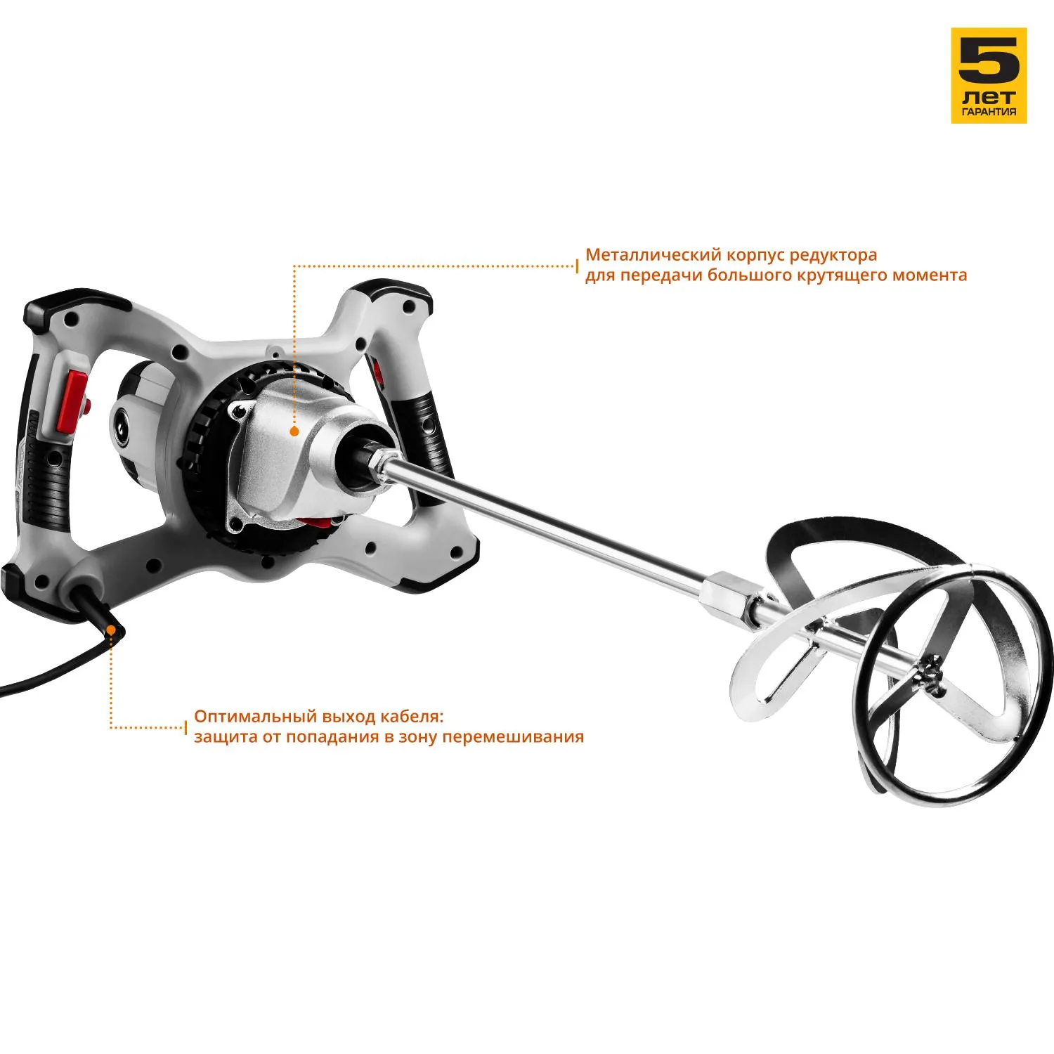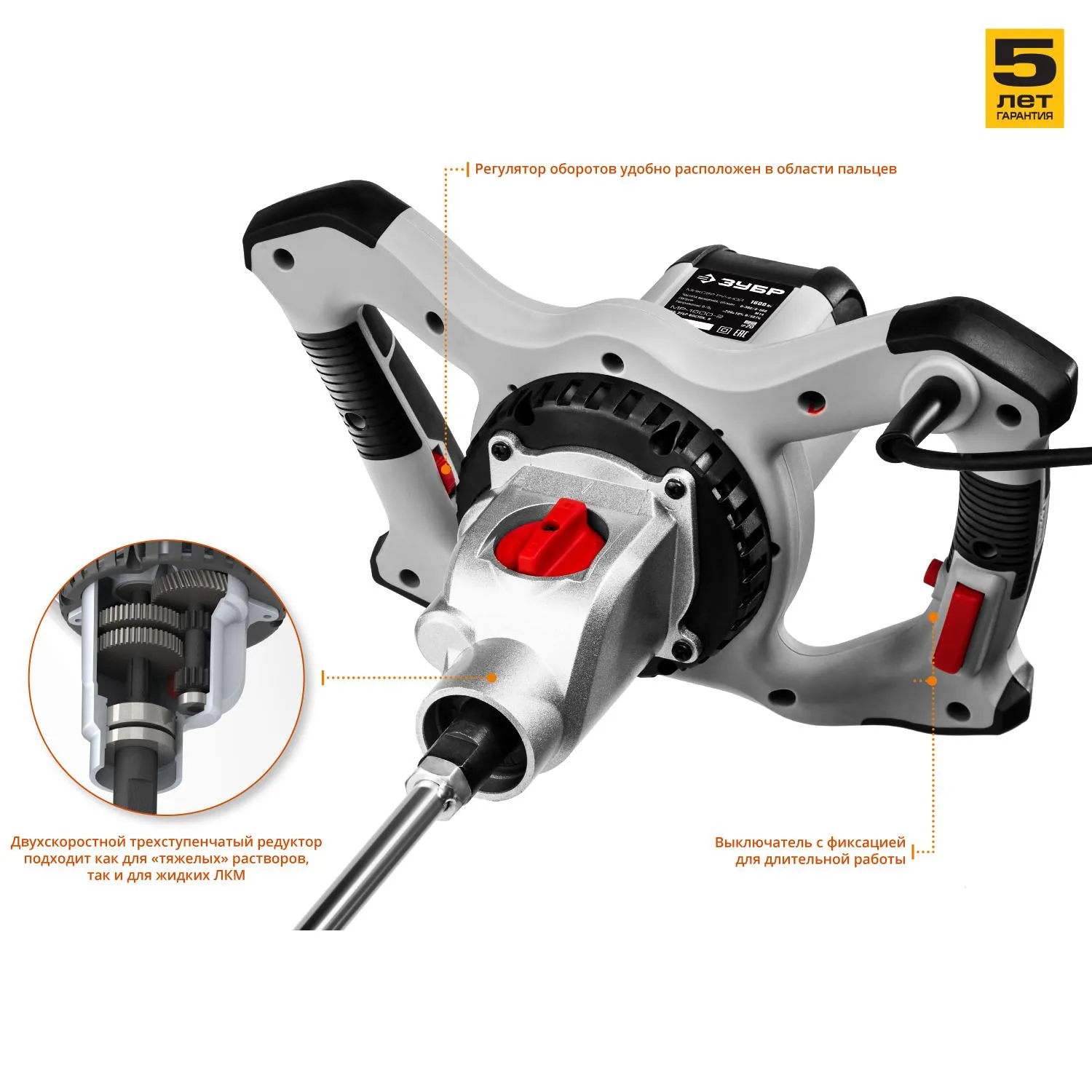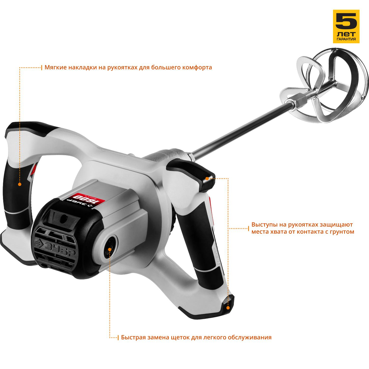 Новая модель в фирменном дизайне ЗУБР. Простой и надежный миксер для перемешивания различных растворов: двухскоростной редуктор для разных материлов, электронная регулировка частоты вращения для плавного изменения, эргономичная рукоятка для удобного хвата. Широкий выбор сменных насадок позволяет работать с разными материалами