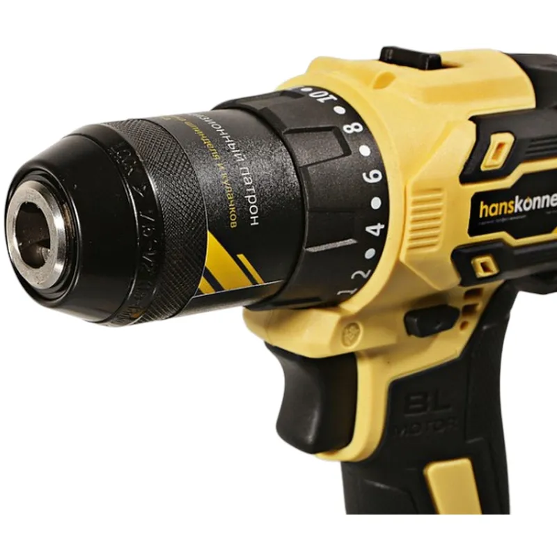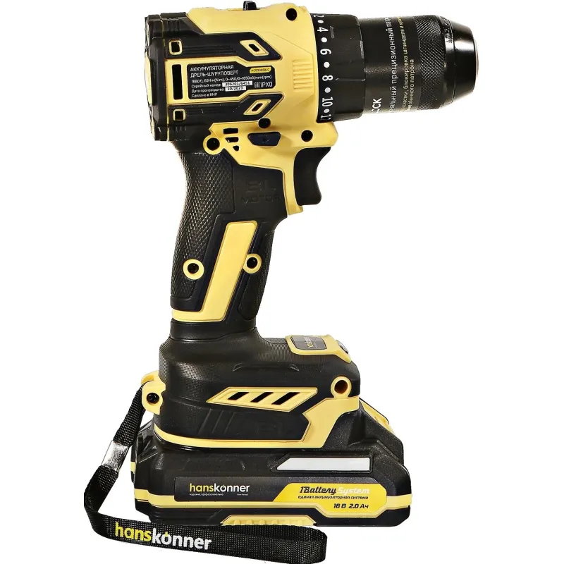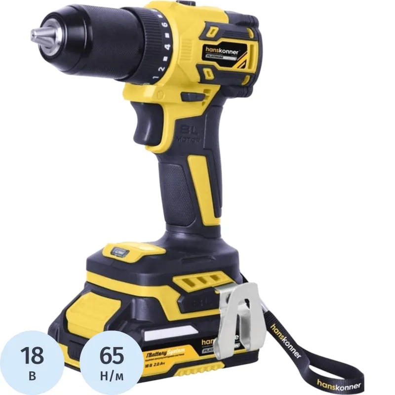 Дрель-шуруповерт аккумуляторная Hanskonner HCD2065BLC бесщеточная 2 АКБ х Li-ion (18В, 2 Ач)+ ЗУ в кейсе.