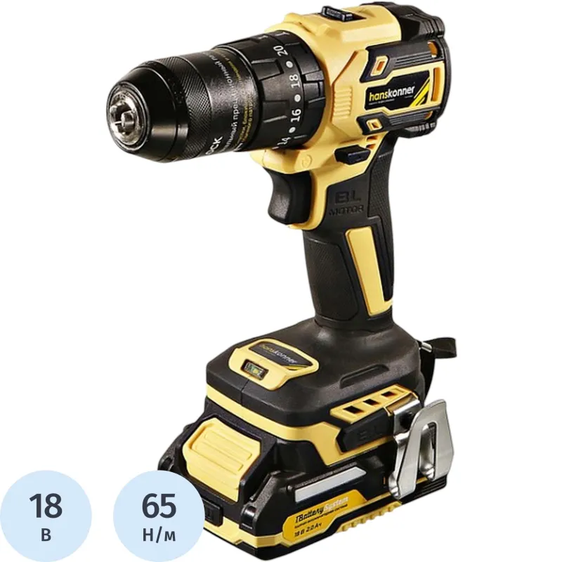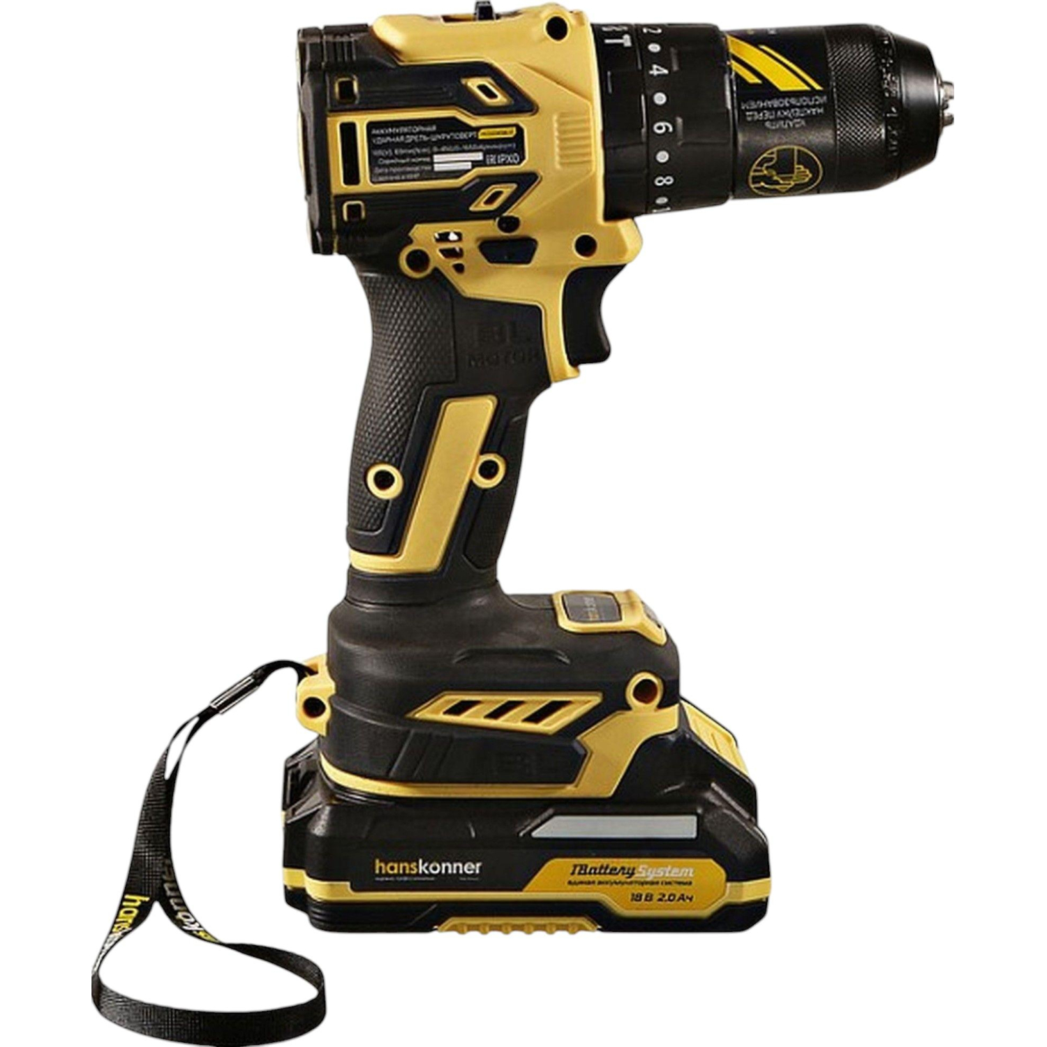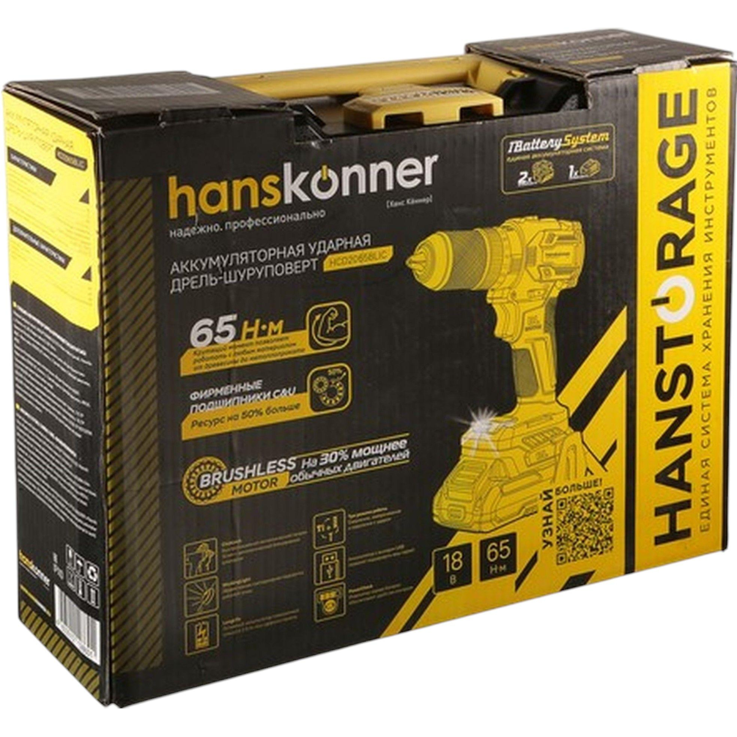 Дрель-шуруповерт аккумуляторная Hanskonner HCD2065BLIC бесщеточная 2 АКБ х Li-ion (18В, 2 Ач)+ ЗУ в кейсе.