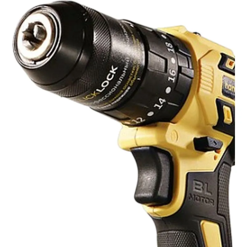 Модель оснащена бесщеточным двигателем с максимальным крутящим моментом 65 Н/м. Двигатель характеризуется высокой производительностью и устойчивостью к перегреву. Шуруповерт имеет две скорости: режим с пониженной скоростью (0-450 об/мин) для работы с крепежом и режим с повышенной скоростью (0-1650 об/мин) для сверления. Размер оснастки (мин/макс): 1.5 - 13. Тип удара: тангенциальный.