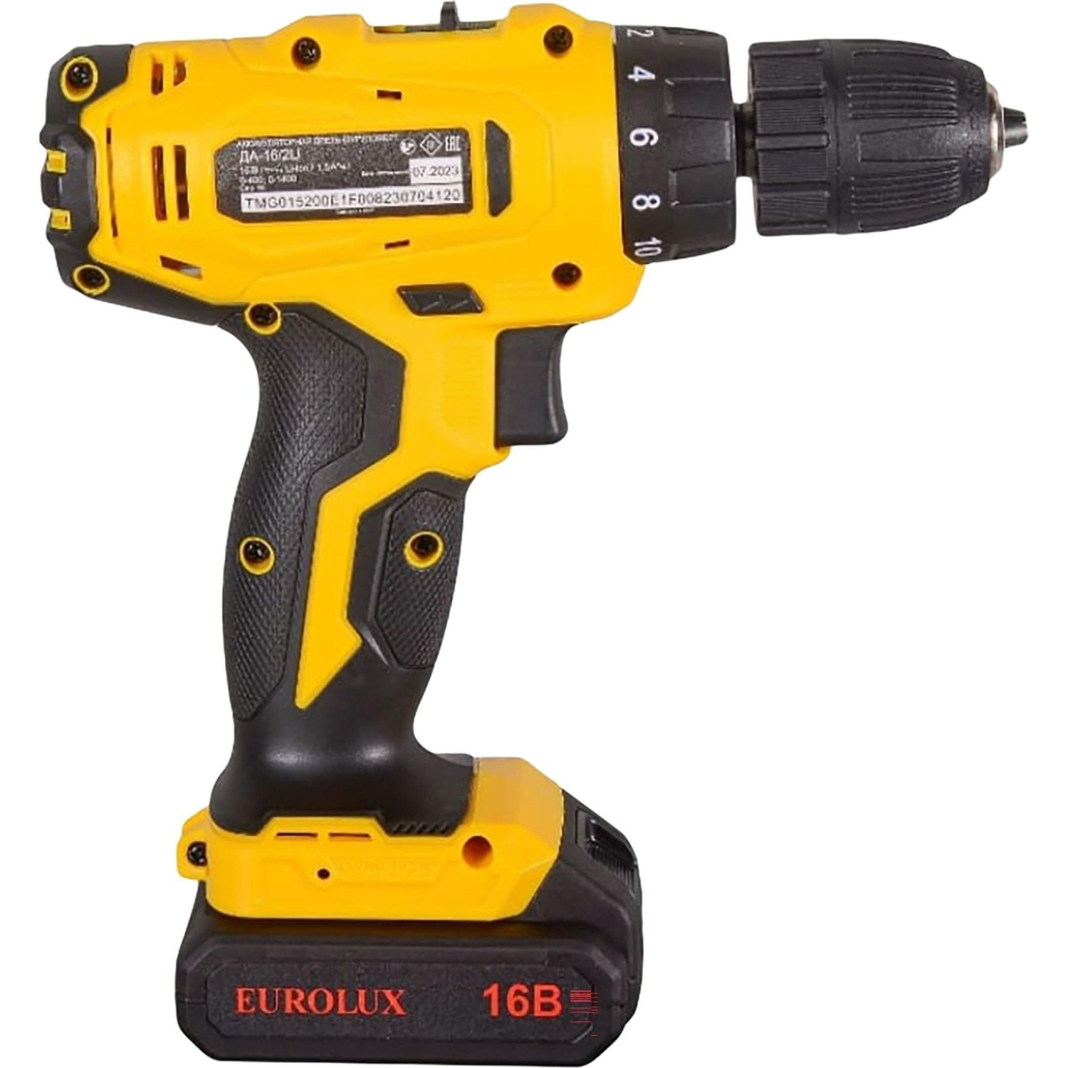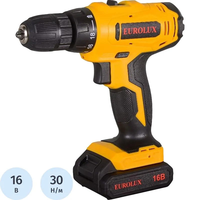 О товаре «Дрель-шуруповёрт аккумуляторная Eurolux ДА-16/2Li 2 АКБ x Li-ion (16 В, 1.5 Ач)+ЗУ в кейсе (72/14/51)»