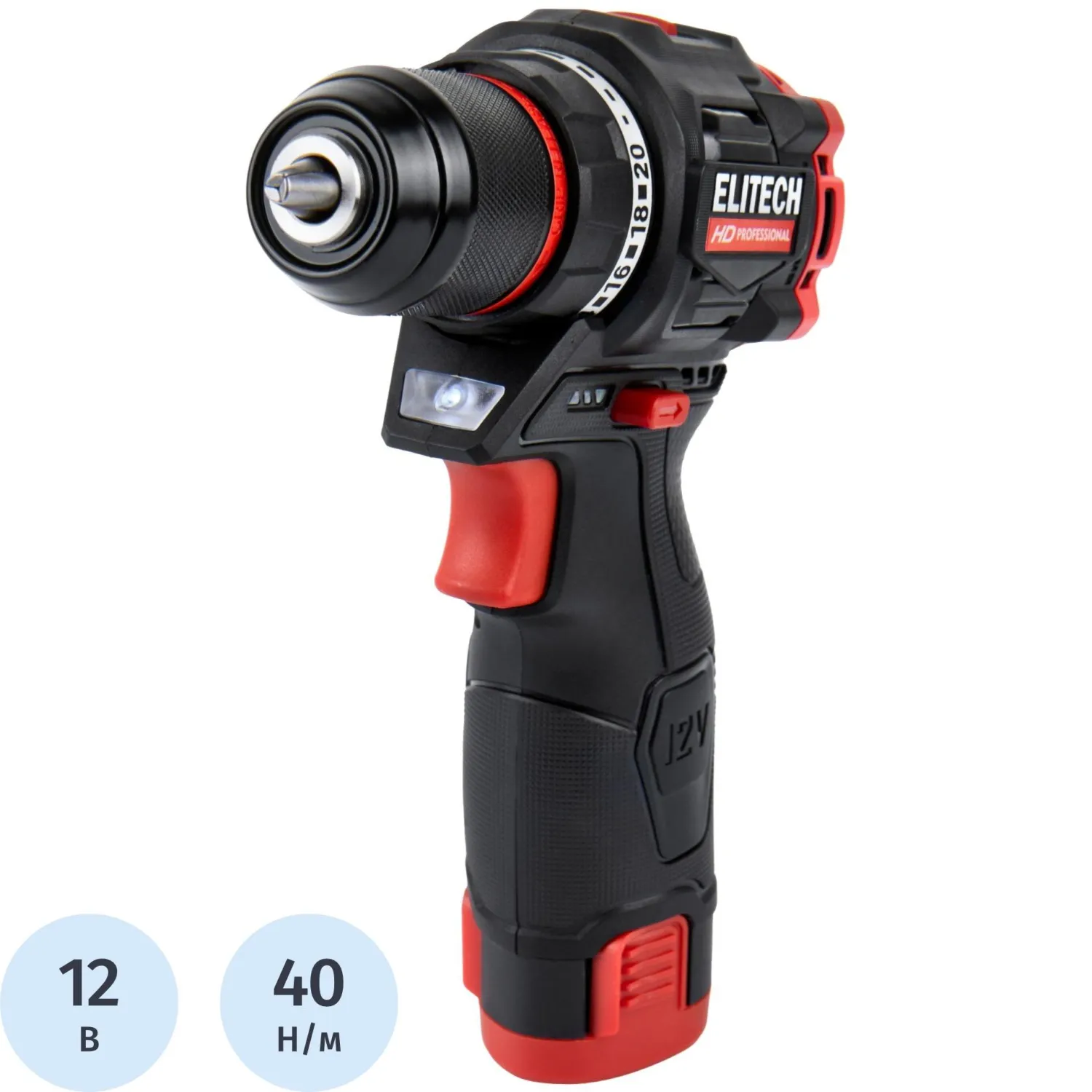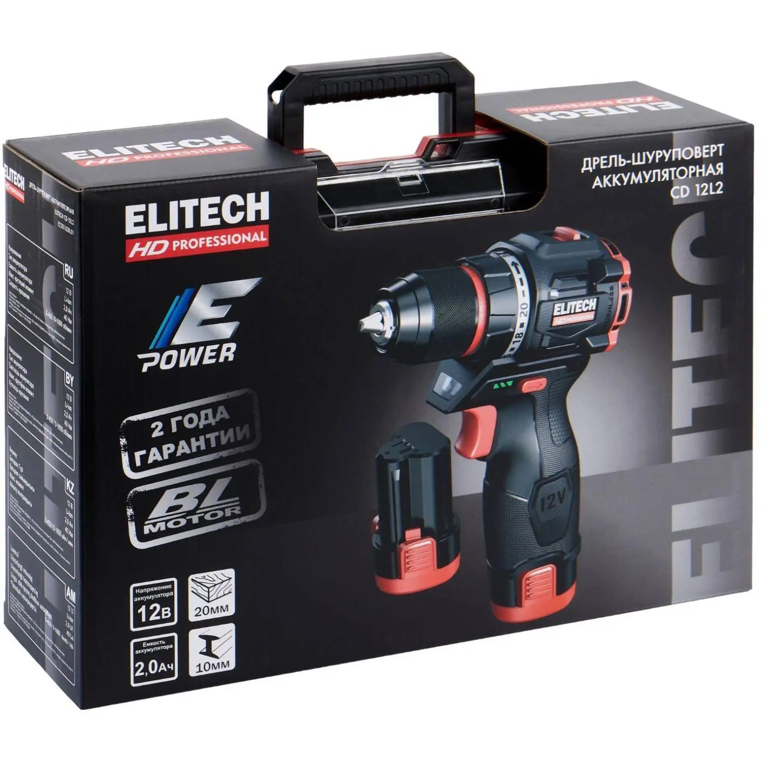 Дрель-шуруповёрт аккумуляторная Elitech HD CD 12L2 бесщёточная 2 АКБ х Li-ion (12 В, 2 Ач)+ЗУ в кейсе (E2201.038.01, 205713)