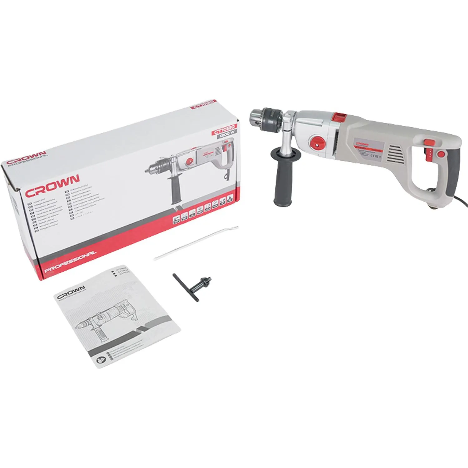 Дрель Crown с микроударом предназначена для сухого сверления кирпичной, каменной кладки и бетона с помощью пустотелых коронок. Помимо сухого сверления алмазными коронками инструмент выполняет стандартные операции: безударное сверление на 1 и 2 ступени, ударное сверление на 1 и 2 ступени, а также заворачивание и выворачивание метизов.