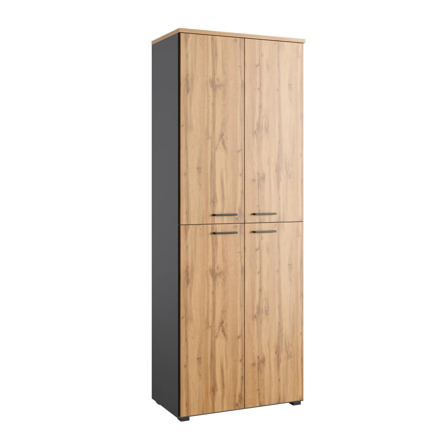 Двери изготовлены из ЛДСП толщиной 16 мм с кромкой ABS-пластик 1 мм. Ручки металлические черного цвета с межосевым расстоянием 128 мм. Материал изготовления и его толщина — ЛДСП толщиной 16 мм. Наличие фурнитуры в комплекте.
