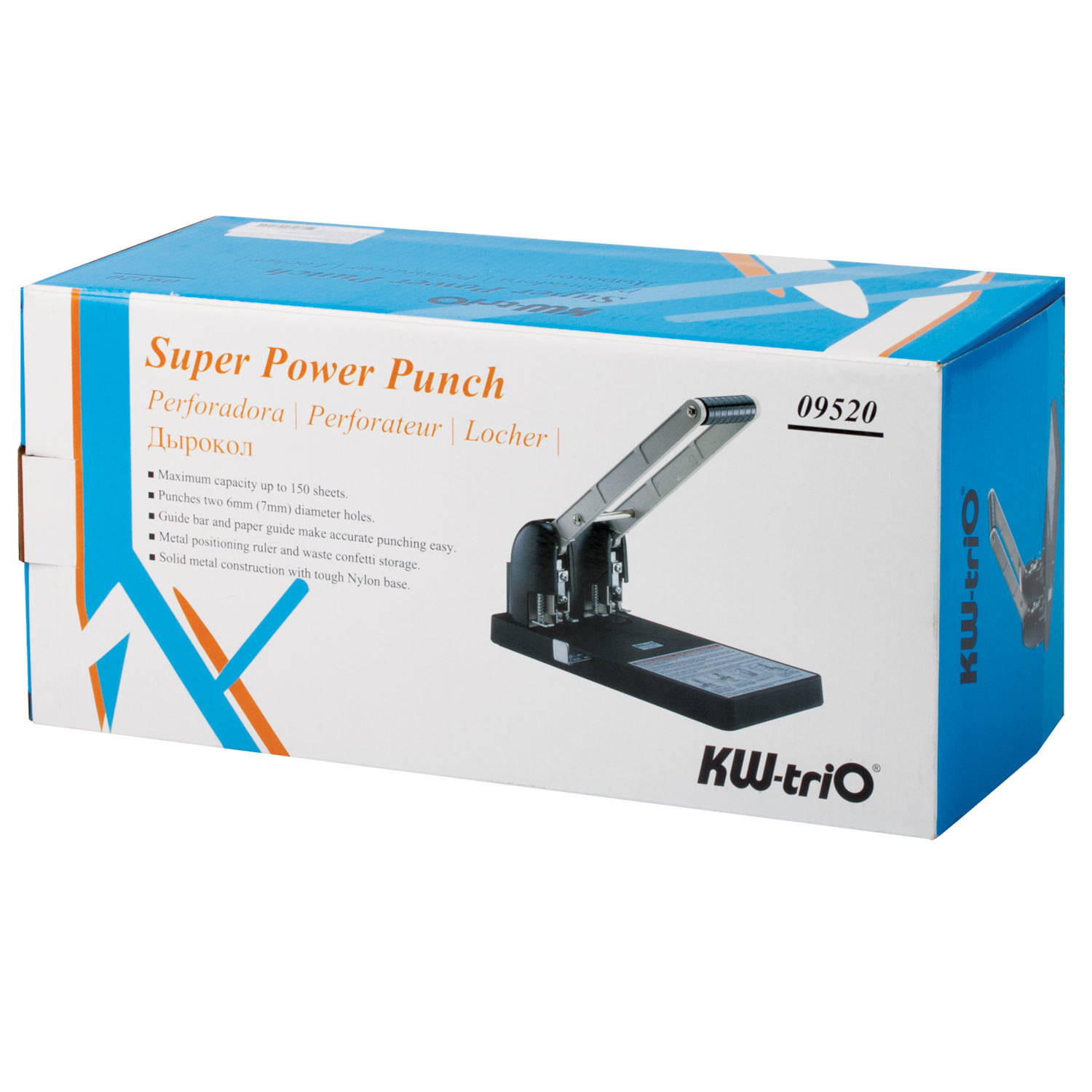 Перфорирует два отверстия диаметром 6 мм, расстояние между отверстиями — 80 мм. В дыроколе предусмотрен отсек для конфетти и выдвижная линейка. Выполнен в металлическом и пластиковом корпусе черного цвета. Легкое и прочное нейлоновое основание.