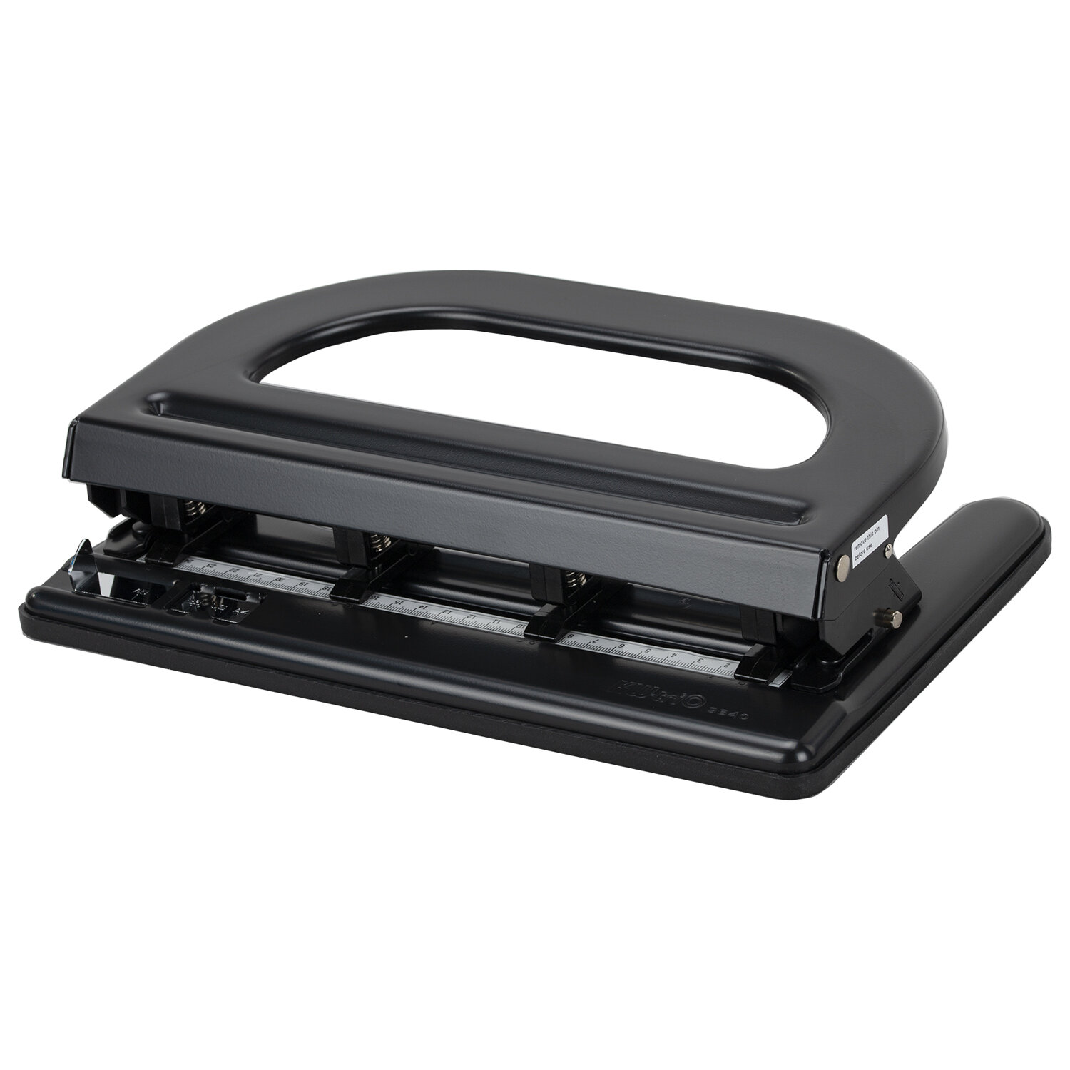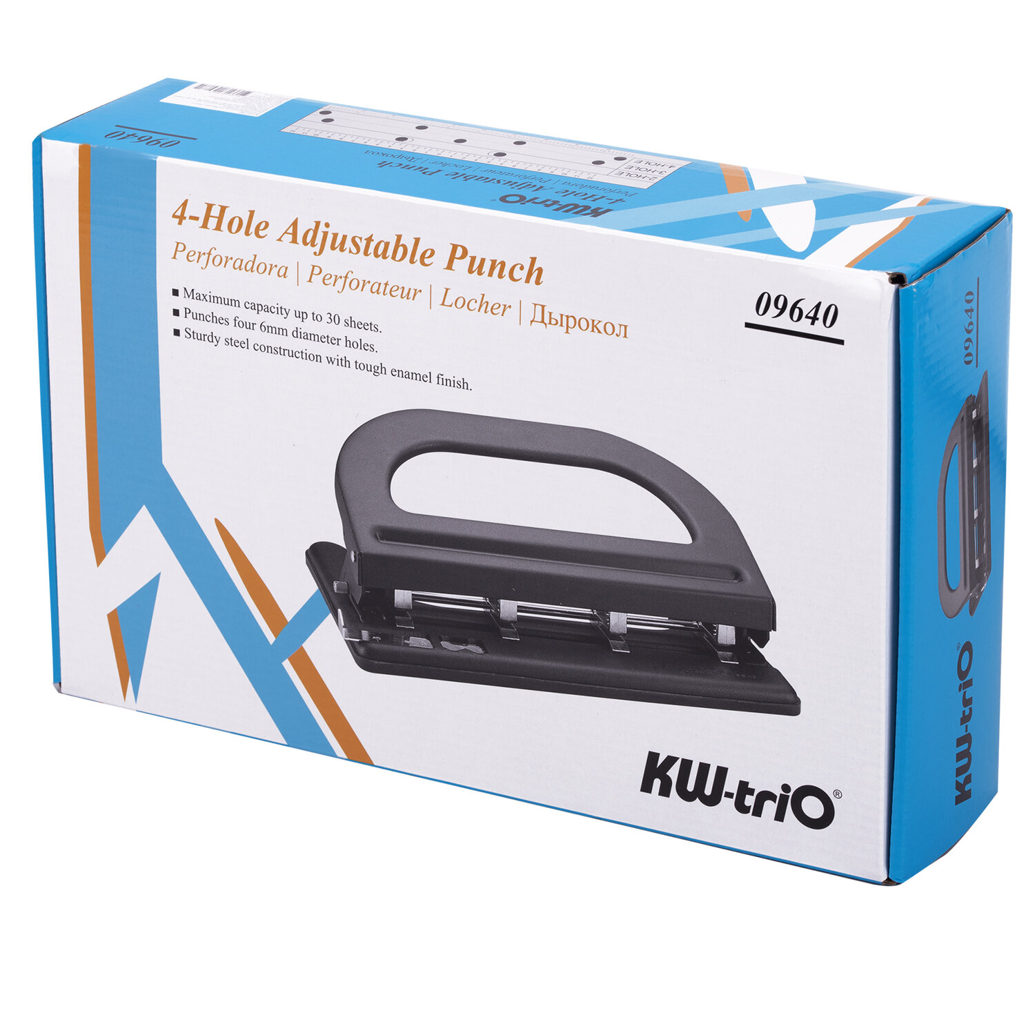 Дырокол KW — Trio 964 пробивает от двух до четырех отверстий в папке из 30 листов бумаги одновременно. Диаметр пробиваемых отверстий — 6 мм. Конструкция позволяет регулировать расстояние между проделываемыми отверстиями. Дырокол снабжен резервуаром для сбора конфетти и линейкой деления на форматы. Выполнен в металлическом корпусе черного цвета.