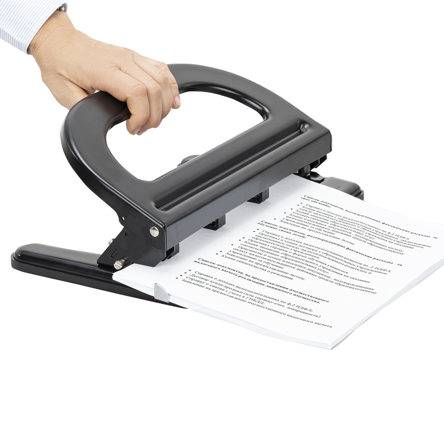 Для эффективного пробивания максимально допустимого объема бумаги необходимо расположить дырокол на горизонтальной твердой поверхности, прикладывая усилия, плавно надавить на рычаг ( при необходимости двумя руками), разномерно распределяя усилия по поверхности рычага.
