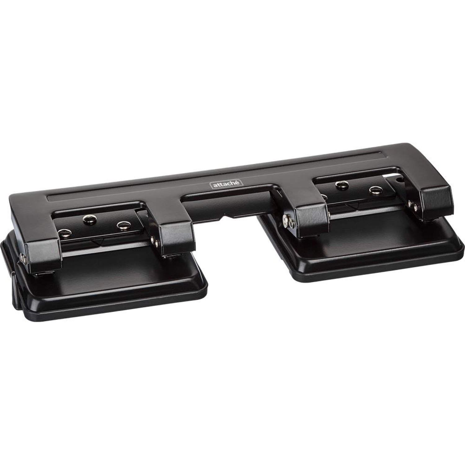 Дырокол Attache пробивает от двух до четырех отверстий в документах толщиной до 15 листов плотностью 80 г/кв.м. Диаметр пробиваемых отверстий — 6 мм, расстояние между отверстиями — 80 мм. Расстояние между проделываемыми отверстиями не регулируется. Наличие линейки с делениями на форматы А3, А4, А5, A6, B4, B5, B6 позволяет зафиксировать бумагу на нужном расстоянии. На корпусе дырокола имеется метка для центрирования. Удобный контейнер легко открывается и закрывается, исключая рассыпание конфетти. Для хранения дырокола в закрытом состоянии имеется металлический фиксатор. Выполнен в металлическом корпусе черного цвета. Размер: 275×97×70 мм. Имеет метку центрирования.