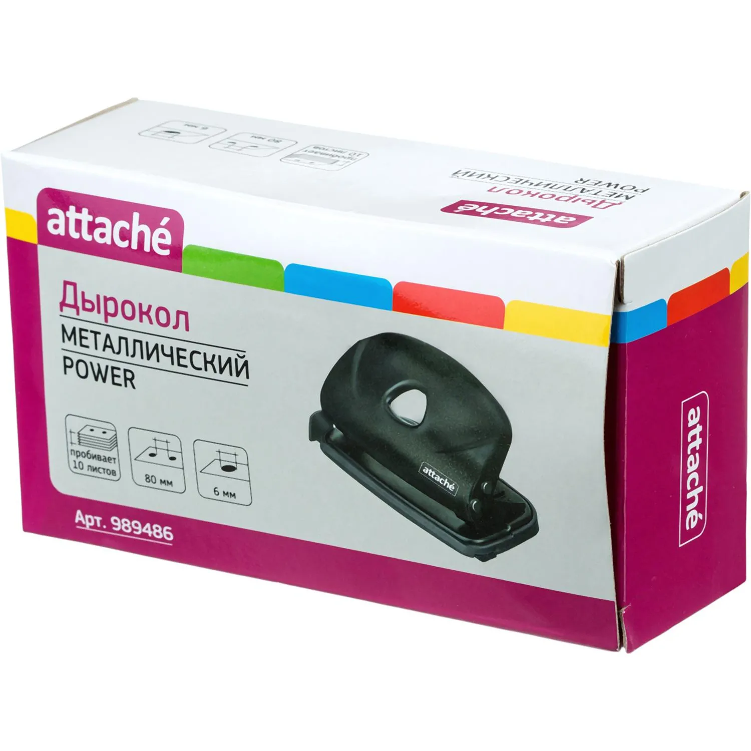 Дырокол Attache Power — это важный и необходимый предмет для комфортной работы в офисе и дома. Дырокол позволяет аккуратно перфорировать документы, чтобы подшить их в папку с двумя и четырьмя кольцами или в скоросшиватель. Стильный дизайн и универсальный черный цвет металлического корпуса подойдут для любого рабочего стола. Одним нажатием возможно пробить отверстия в документе толщиной до 10 листов плотностью 80 г/кв.м. Дырокол делает два отверстия диаметром 6 мм, расстояние между отверстиями — 80 мм. Пробойники дырокола изготовлены из высококачественного металла, что позволит им прослужить дыроколу долго и без сложностей пробивать листы бумаги. Удобный контейнер для конфетти легко открывается и закрывается, исключая его рассыпание. Наличие линейки с делениями позволяет зафиксировать бумагу на нужном расстоянии и пробить отвестия в бумаге в соответствии с ее размером. Удобно работать с форматами A3, А4, А5, А6, B4, B5, B6. Отметка на линейке 888 позволяет производить 4 отверстия. Метка центрирования отсутствует.