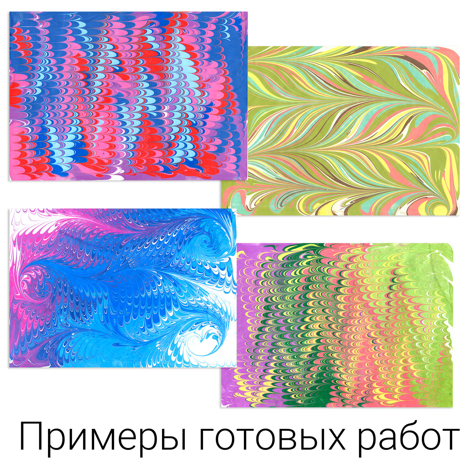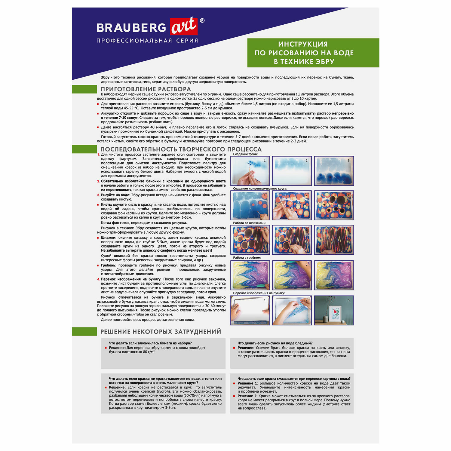 С помощью набора можно создать не менее 40 практически неповторимых Эбру-рисунков по инструкции или на свободную тему, которые станут прекрасным подарком членам семьи и друзьям. Бумагу с Эбру-орнаментом можно использовать для изготовления открыток и в декорировании. Эбру-рисунок можно также перенести на ткань, дерево и другие шероховатые поверхности.
