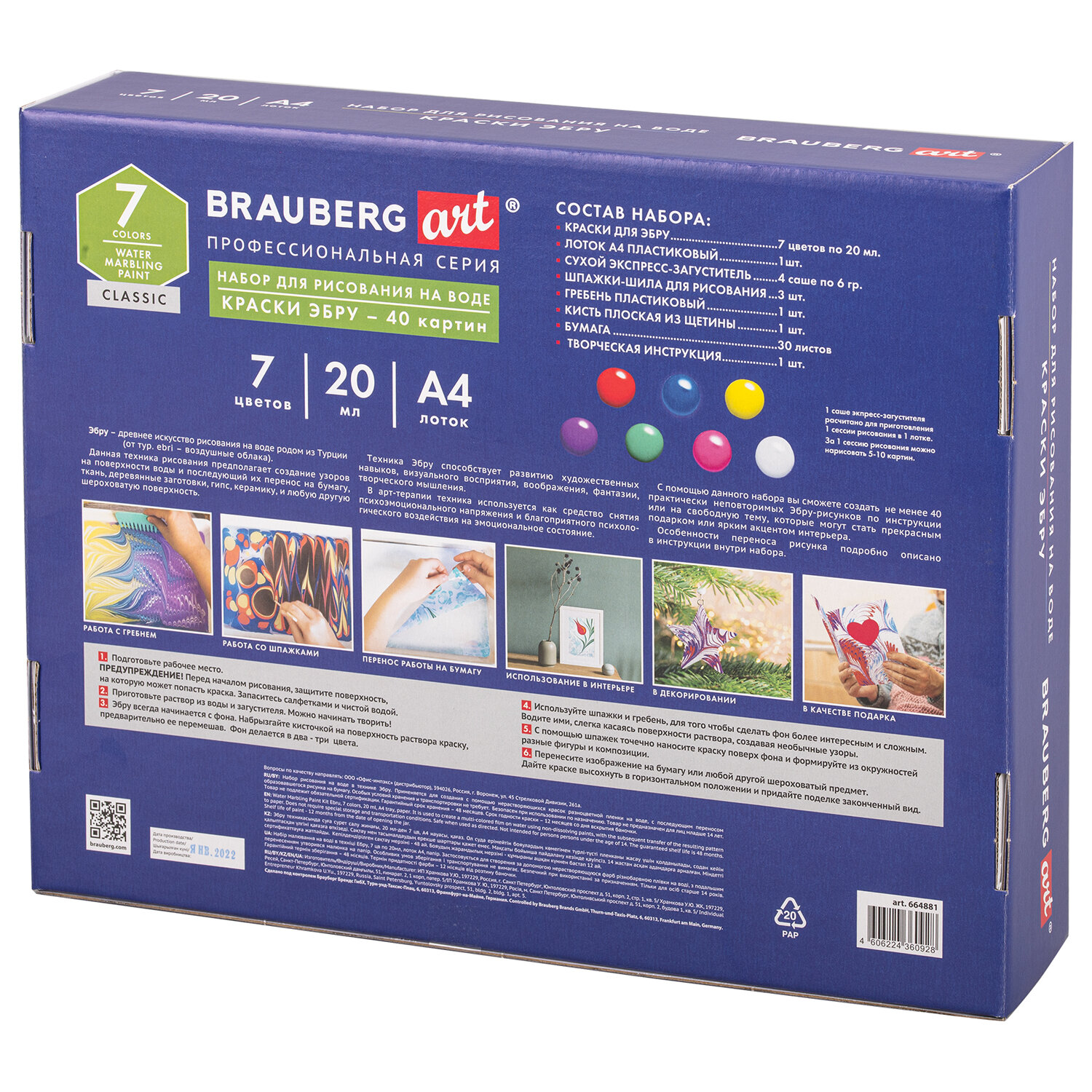 О товаре «ЭБРУ набор для рисования на воде 7 цветов х 20 мл (40 картин), лоток А4, BRAUBERG ART, 664881»