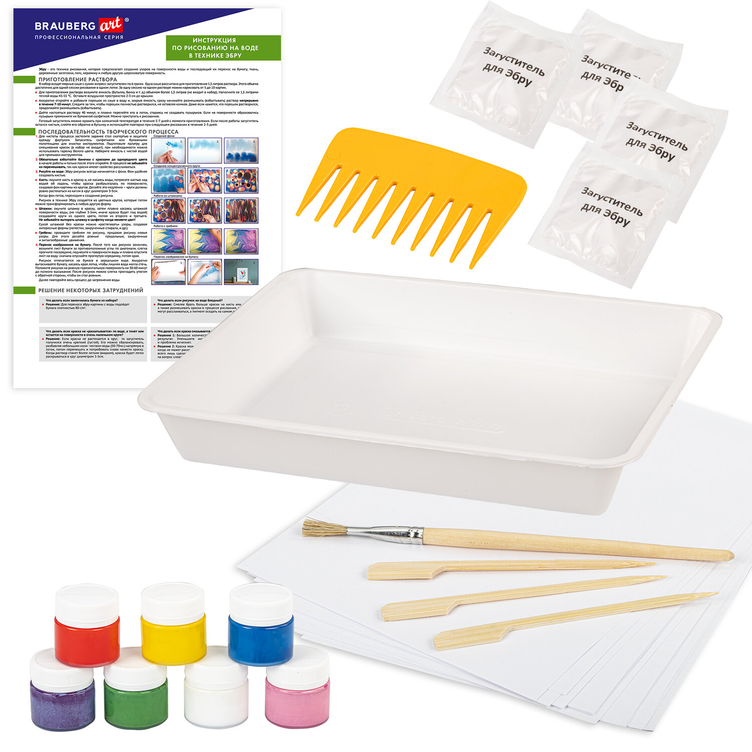 Рисование на воде в технике Эбру – древнее искусство создания узоров на поверхности воды с последующим их переносом на бумагу, ткань, гипс, керамику, и любую другую шершавую поверхность. В набор входят: 7 баночек со специальной краской (красный, синий, зеленый, белый, желтый, белый, фиолетовый, розовый) по 20мл., 1 пластиковый лоток размером А4, бумага 30 листов размером А4, 4 саше с загустителем, кисть, гребень, 3 деревянных шпажки, подробная творческая инструкция.