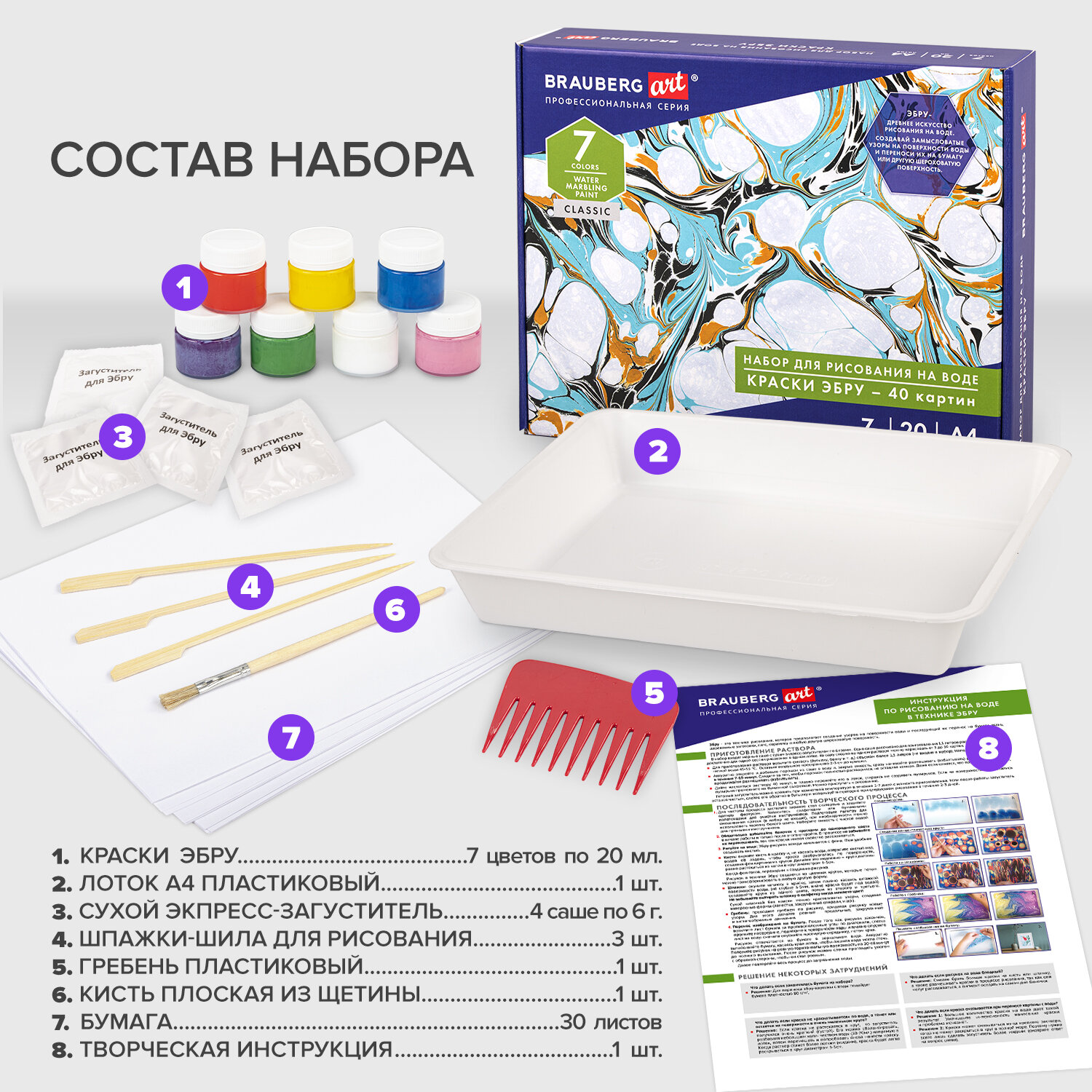 ЭБРУ набор для рисования на воде 7 цветов х 20 мл (40 картин), лоток А4, BRAUBERG ART, 664881