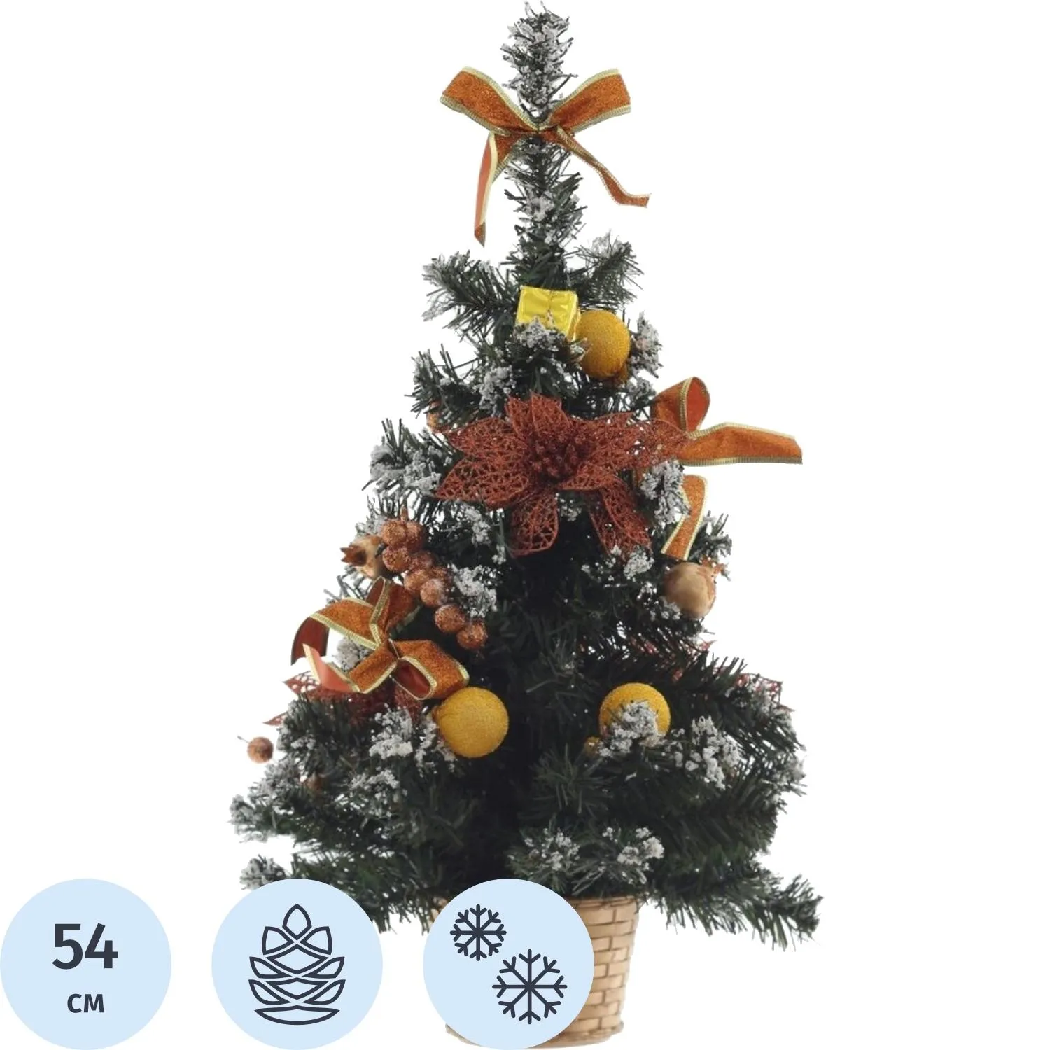 Искусственная настольная ёлка высотой 54 см выполнена из ПВХ с эффектом заснеженности. Модель предназначена для украшения интерьера дома или офиса, создавая атмосферу зимнего уюта и праздника.