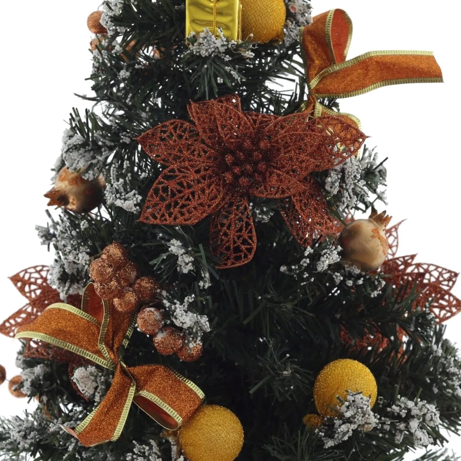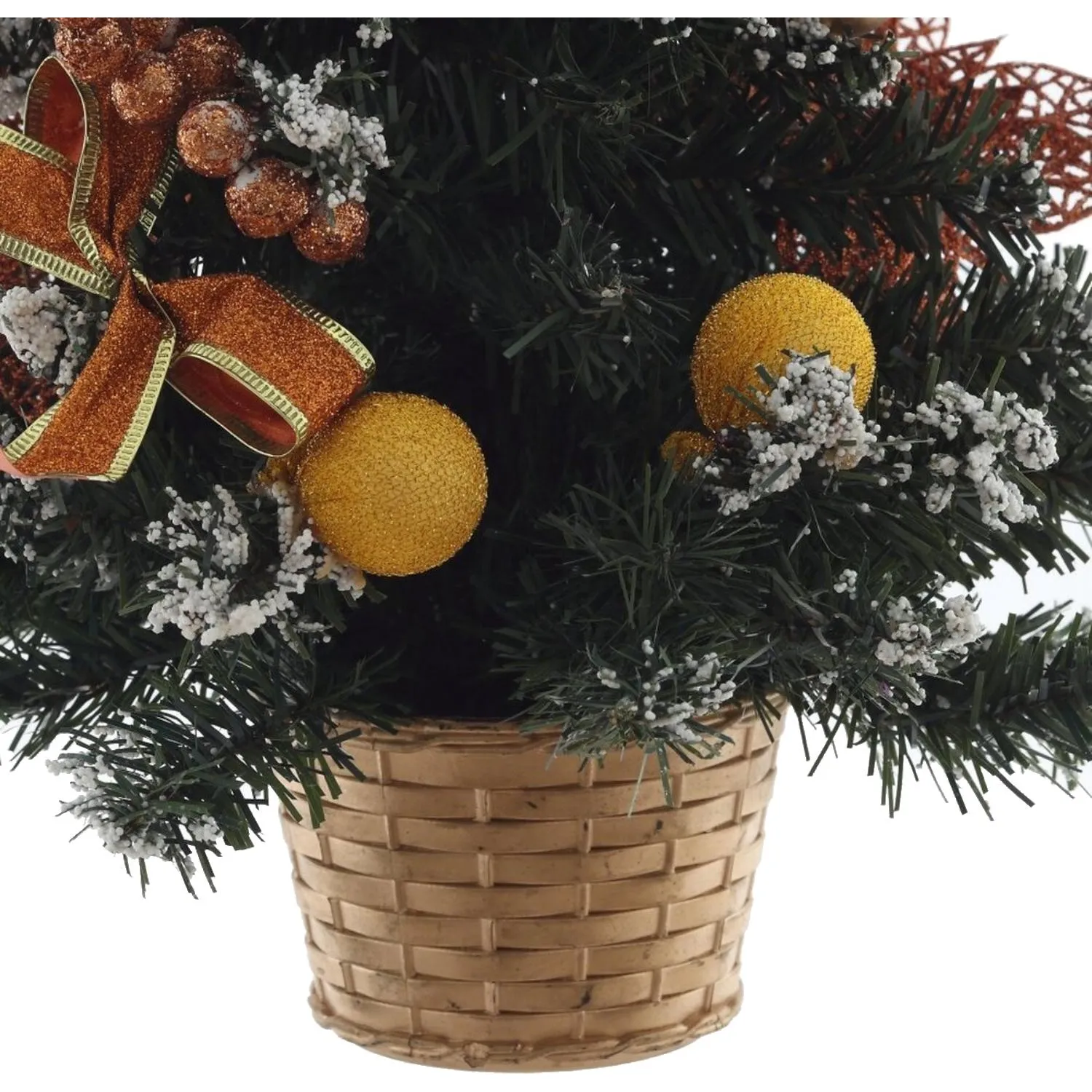 Изделие украшено игрушками, цветами и бантами в зелёно-золотистой цветовой гамме. Диаметр нижнего яруса составляет 32 см. Размер ёлки — 54×32×32 см, вес — 0.29 кг. Поставляется в плёнке, упаковка соответствует размерам изделия.
