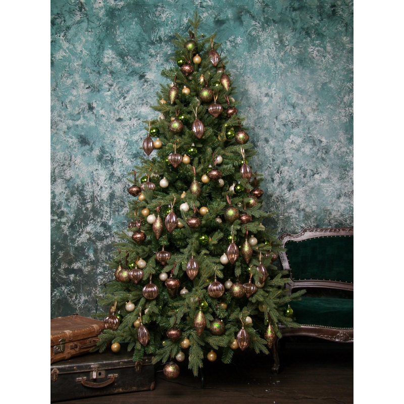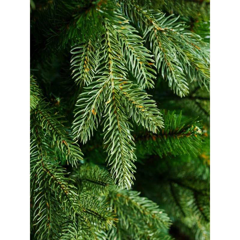 Искусственная напольная ёлка высотой 240 см выполнена из комбинированной хвои насыщенного зелёного цвета. Ветви по краям кроны изготовлены из литой мягкой резины, а ближе к стволу — из плёнки ПВХ. Благодаря такому сочетанию хвоя выглядит густой, пушистой и реалистичной, а сам ствол визуально скрыт. Конструкция включает 17 ярусов и 1195 веток, которые легко отгибаются и расправляются, создавая плотную и объёмную крону. Хвоя гипоаллергенна, не имеет запаха и не поддерживает горение. В комплект входит противопожарный паспорт.