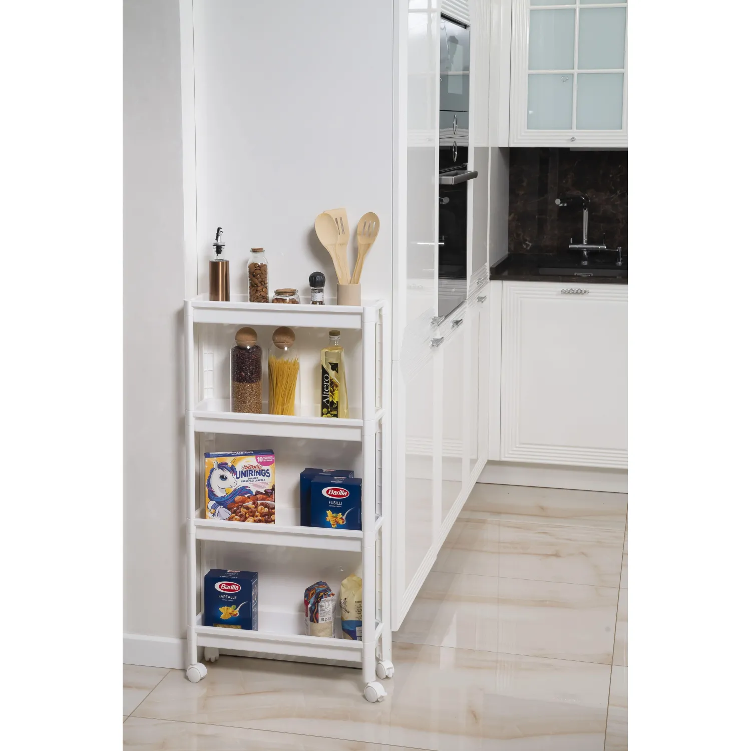 Этажёрка VIKEA 786406 — это превосходное решение для оптимальной организации пространства в доме. Она идеально подойдёт для хранения вещей на кухне, в ванной, в гостиной или даже на балконе. Важным аспектом при выборе мебели является надёжность и качество. Этажёрка имеет надёжную конструкцию, где все стойки и полки надёжно соединены друг с другом, обеспечивая максимальную стабильность и прочность. Благодаря своей компактности легко помещается даже в самых маленьких помещениях, обеспечивая достаточно места для хранения различных предметов. Этажёрка поставляется в разобранном виде в индивидуальной коробке. Размеры этажерки — 530×175×1055 мм. Это позволяет удобно вписать её в любое помещение, не занимая при этом много места. Этажёрка оснащена четырьмя колёсами с фиксаторами, что обеспечивает свободное перемещение её из одного места в другое. Можно легко переместить этажёрку в нужное место, а затем закрепить её колёса за фиксаторы: так она будет надёжно закреплена и не будет двигаться во время использования. Каркас этажёрки выполнен из высококачественного материала, который не подвержен коррозии и износу. Это гарантирует этажёрке долговечность и надёжность.