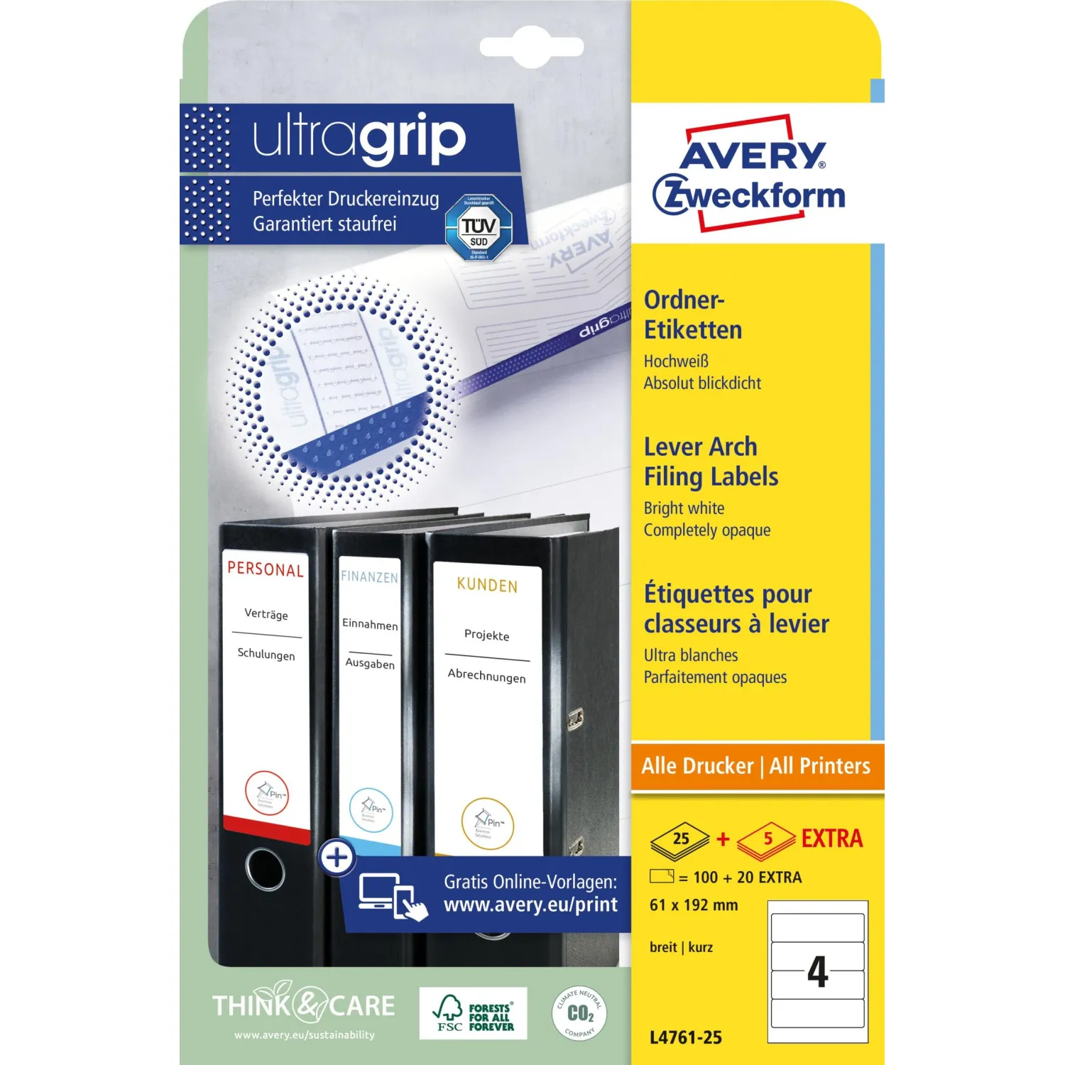 Этикетки самоклеящиеся для папок-регистраторов Avery Zweckform (L4761-25) белые 192x61 мм 4 штуки на листе (25 листов в упаковке)