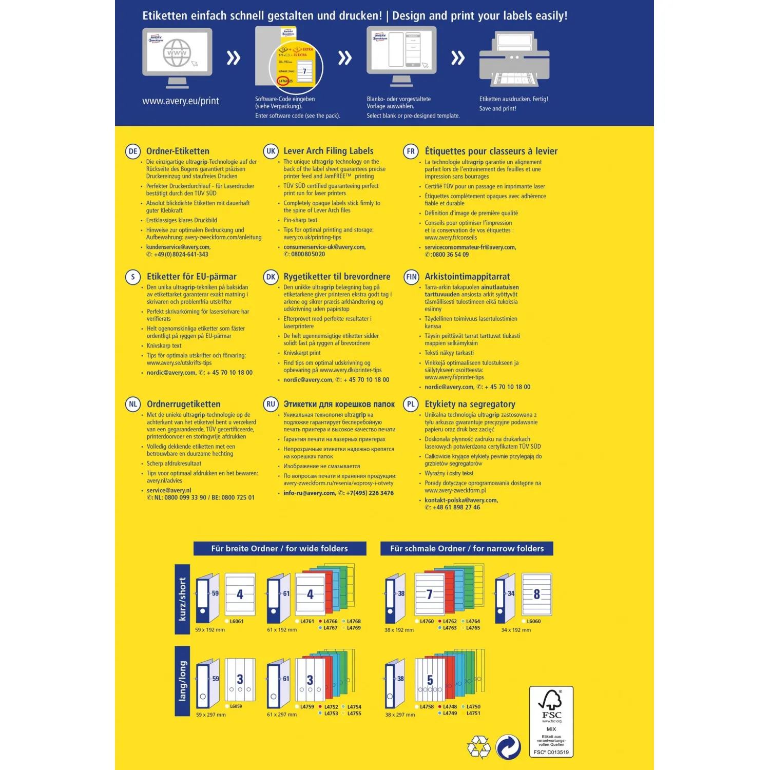 Белые этикетки, размер 61×192мм от Avery Zweckform для широких/коротких папок марки Leitz, Elba, Esselte, Mehle, Herlitz и Bene. Гарантированная абсолютно точная подача листов в принтер и печать без застревания благодаря технологии ultragrip. Гарантированную печатать этикеток на офисном принтере без застревания подтверждает немецкая сертификация TÜV SÜD (Объединение Технического надзора). 100 этикеток для корешков папок + 20 дополнительных бесплатно. Этикетки полностью скрывают старый текст на корешке, что позволит существенно сэкономить на покупке недешевых папок. Все этикетки имеют сертификацию FSC® (Forest Stewardship Council). Материал этикеток получен из ответственно управляемых лесов. Этикетки сделаны из
